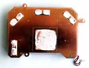 - Уменьшение объема памяти с 256 до 128 мегабайт получилось путем недокомплектации микросхемами памяти (на оборотной стороне можно увидеть пустые места под BGA-микросхемы. Однако 256-битная шина не обрезалась, ведь на карте установлено 8 32-битных микросхем памяти (то есть всего 256бит). Просто уже невозможен так называемый двубанковый режим работы памяти.