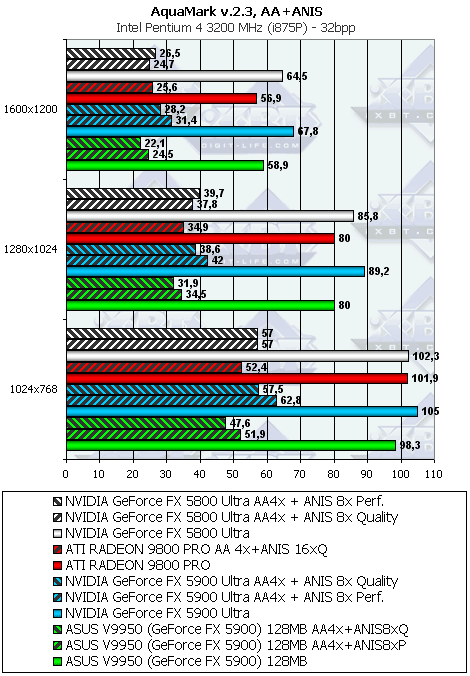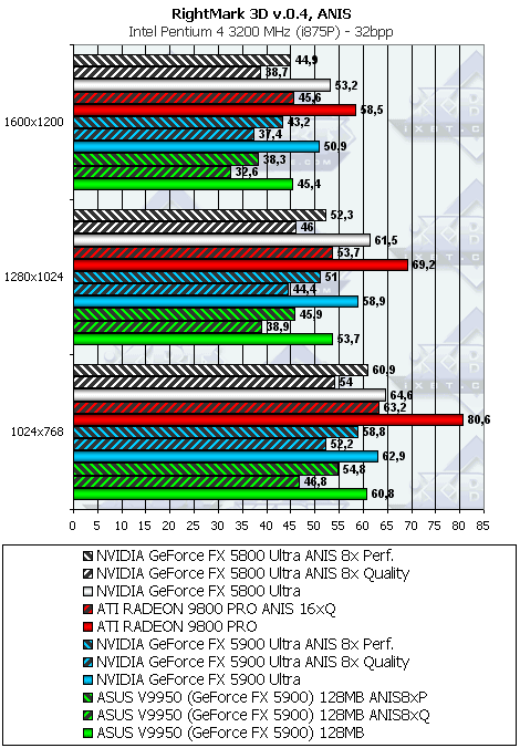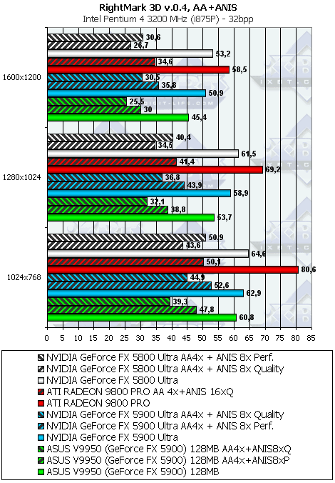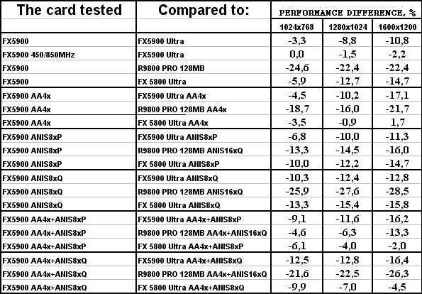 Без АА и анизотропии FX5900 практически везде проиграл. АА восстановил лидерство у продукта только в отношении 5800 Ultra (что не удивительно из-за разности шин). С анизотропией выгрыш только у RADEON 9800 PRO. Но в целом в тяжелых режимах с АА и анизотропией победа снова у FX5900.