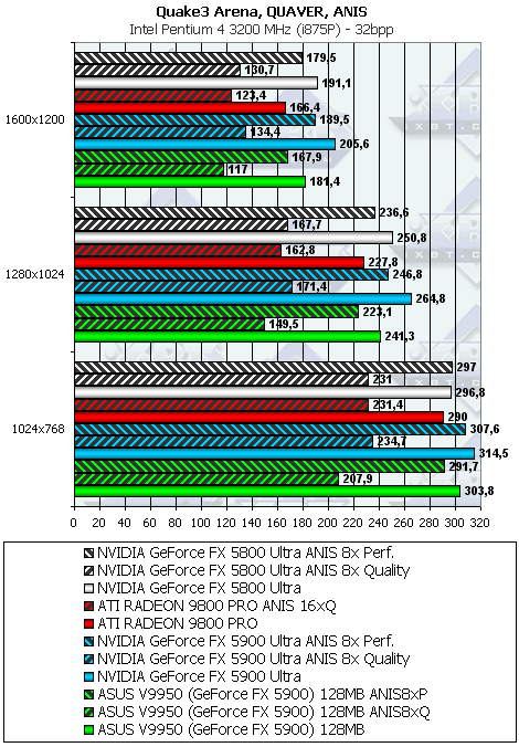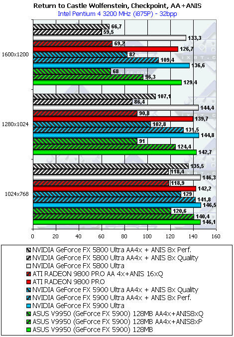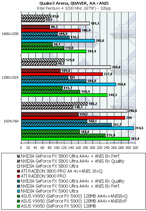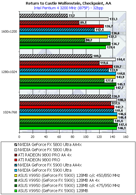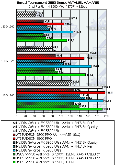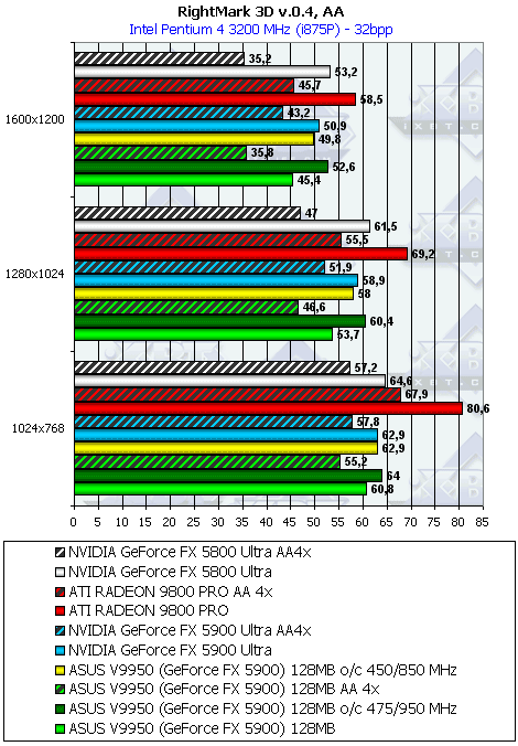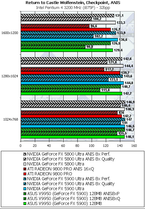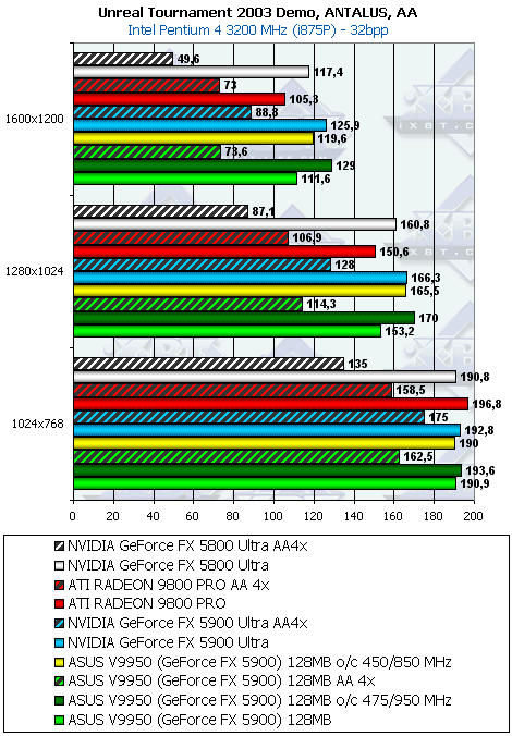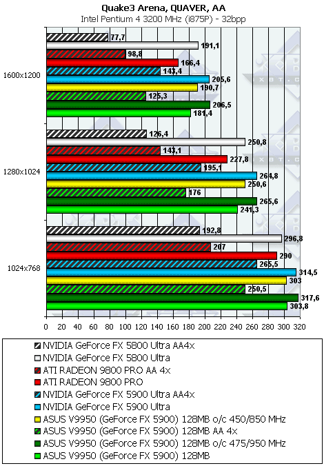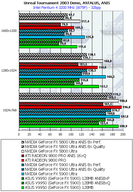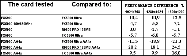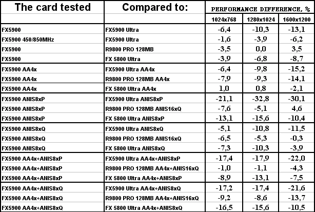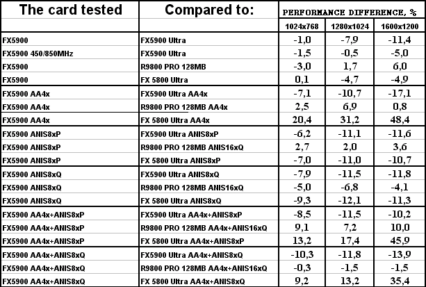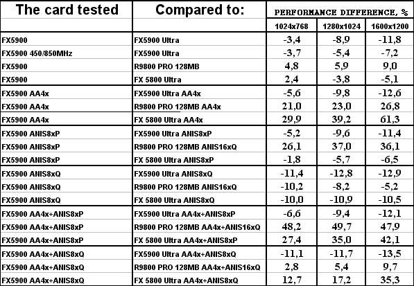 Без АА и анизотропии FX5900 немного быстрее соперника в лице RADEON 9800 PRO, а в высоких разрешениях отстает от FX 5800 Ultra (сказывается более низкая частота ядра). С АА карта сильно быстрее обоих соперников, а в с анизотропией снова отстает от 5800 Ultra по той же причине. Однако в конечном счете при самой тяжелой нагрузке равных FX5900 нет.