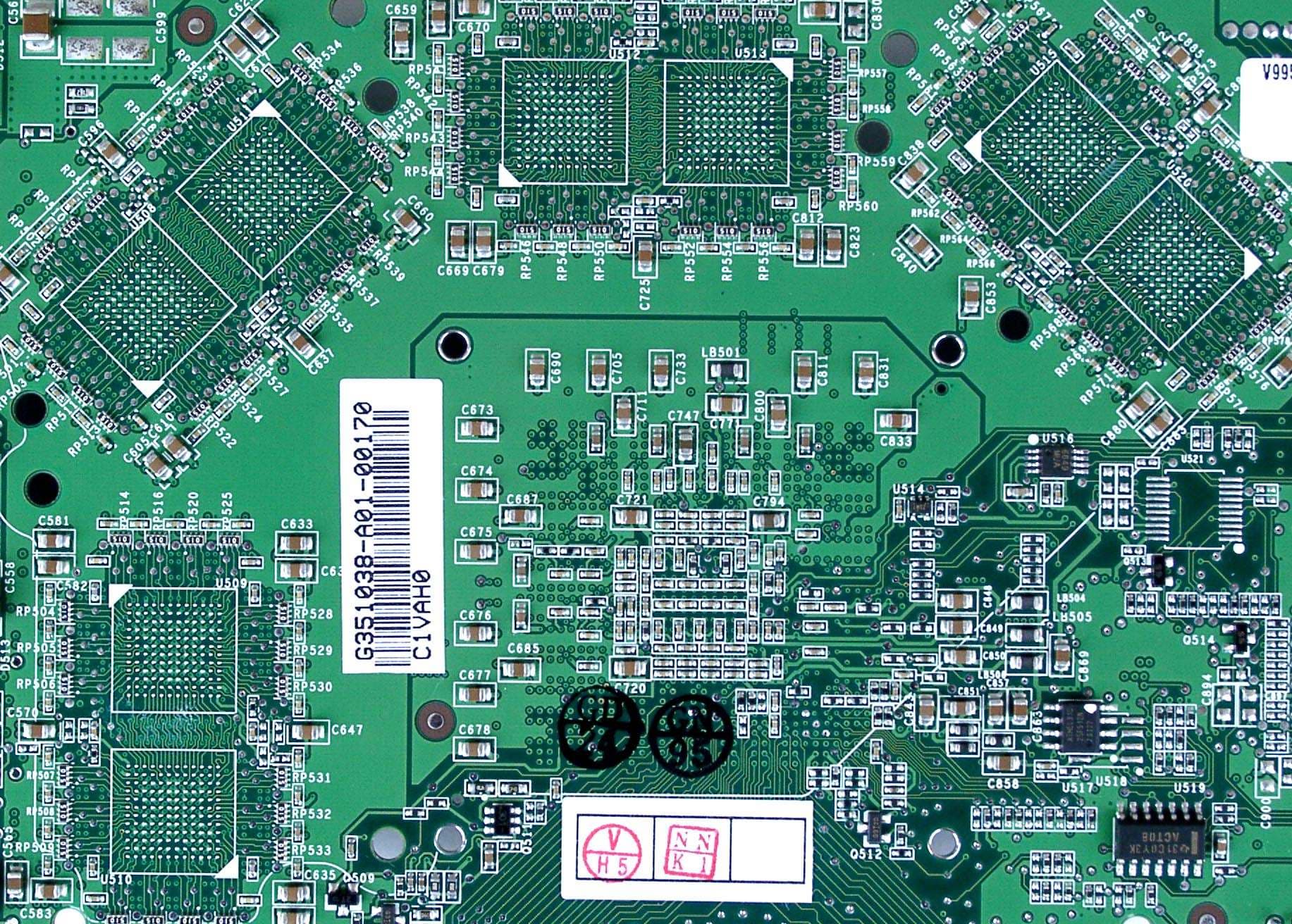 - Как я уже ранее отмечал, дизайн PCB очень сложный, для сравнения мы привели фотографию PCB от Matrox Parhelia также с разведенной шиной в 256 бит; видно, что есть некоторое сходство в насыщенности PCB элементами.