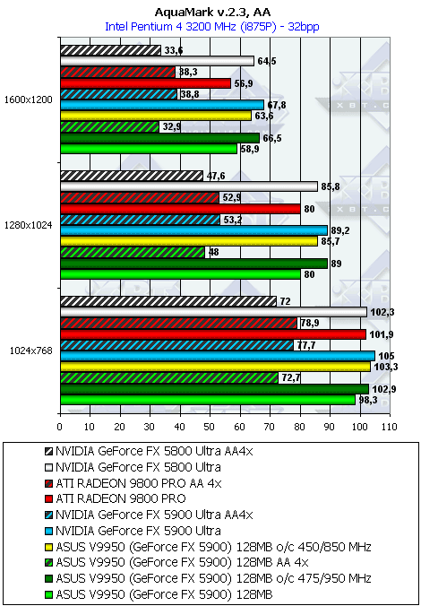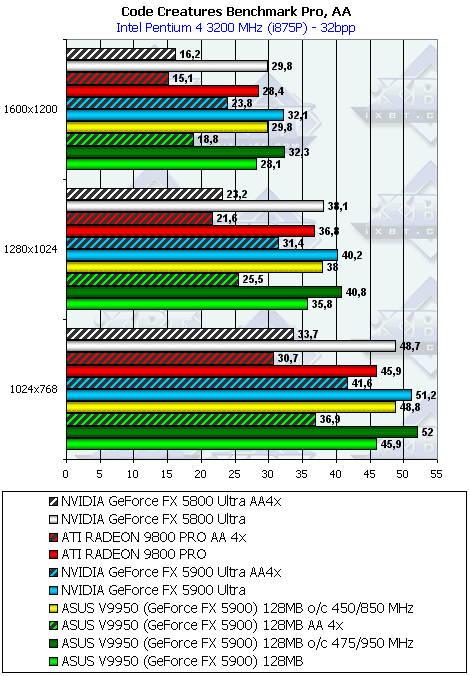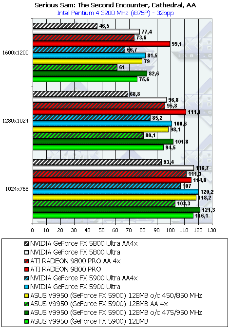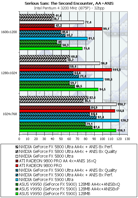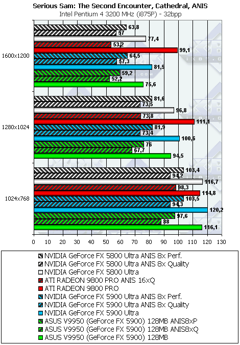 Без АА и анизотропии FX5900 идет практически на равных с RADEON 9800 PRO и немного отстает от 5800 Ultra, поскольку в этом тесте главную роль играет филлрейт чипа, а он у 5900 меньше, чем у 5800 Ultra. К сожалению, анизотропия у всех FX в этом тесте не работает, вероятно ошибка в драйверах, или преднамеренное действие программистов (заточки). А с АА у FX5900 все в порядке, продукт на первом месте.