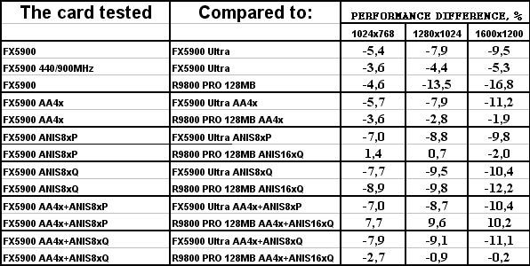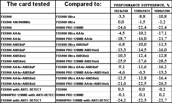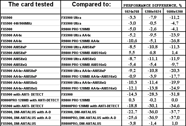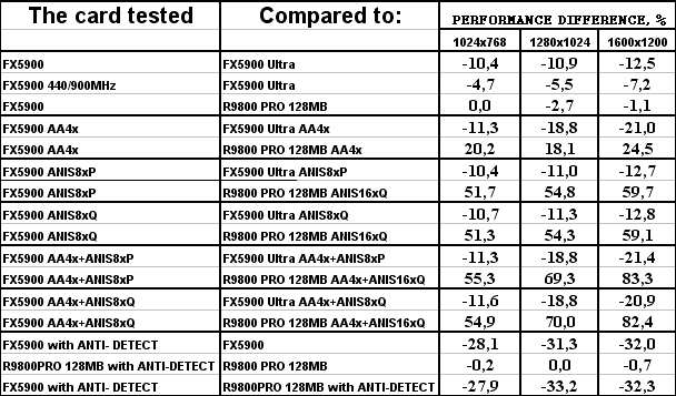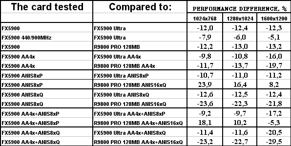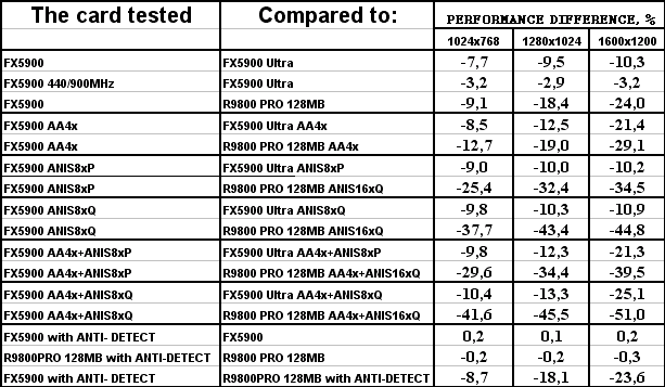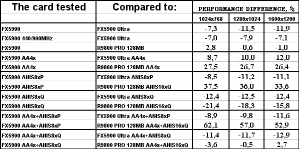 Итак, если предыдущие тесты, основанные на общепринятых демках-бенчмарках, либо на включенных в стандартные поставки игр, нам показывали, что у GeForce FX 5900 были очень хорошие шансы побороться с RADEON 9800 PRO, да и в большинстве случаев просто выигрывать сражения, то исключение влияния «заточек» путем смены тестовых демок-бенчмарков на созданные специально для объективного тестирования показало, что FX 5900 вовсе не так уж хорош, как его рисовали пиарщики NVIDIA.