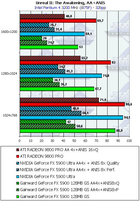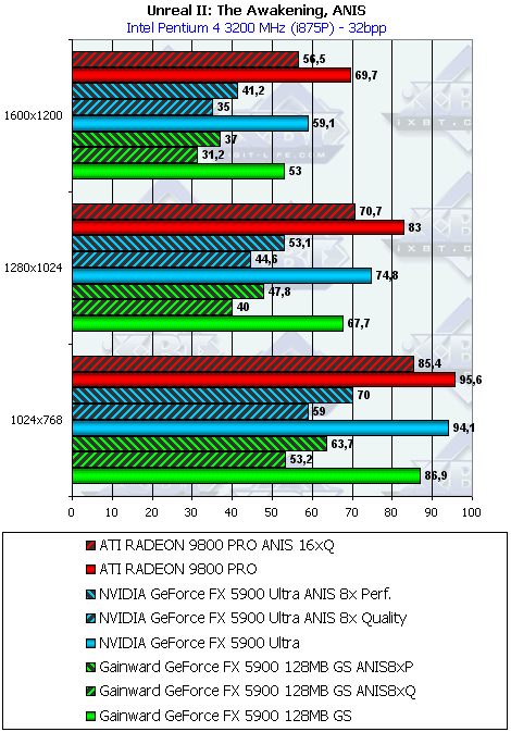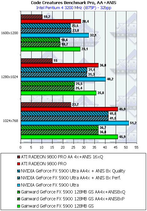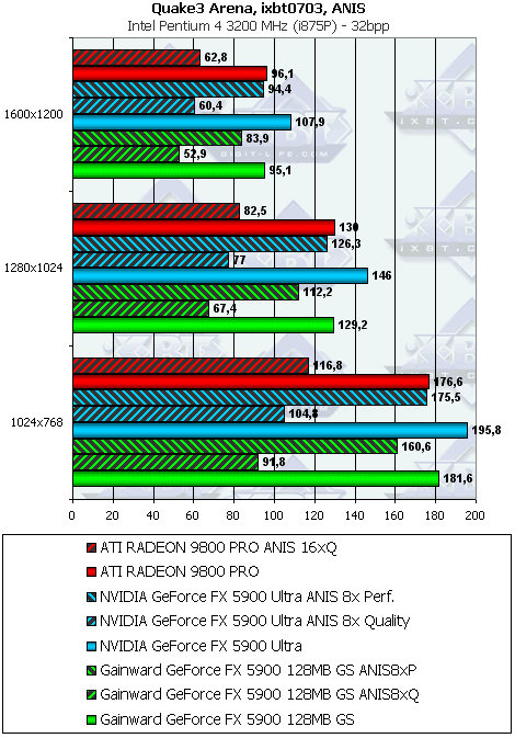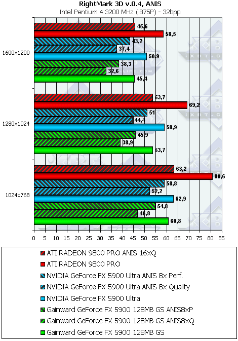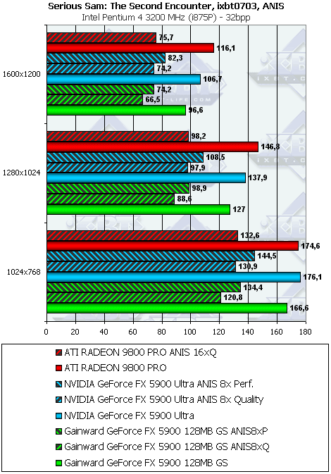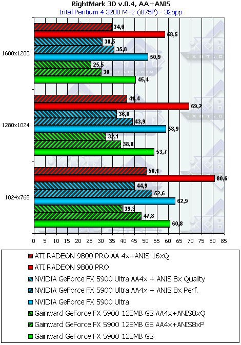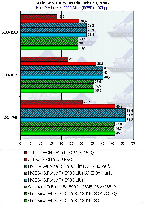 Тестирование на новой демке-бенчмарке показало, что FX 5900 держит верх только в режимах без АА и анизотропии, а также при включенной анизотропной фильтрации в режиме Performance. Впрочем, с учетом особенностей реализации анизотропии у RADEON 9800 PRO, мы можем вполне компромиссно сравнить максимальный уровень этой функции у продуктов ATI с аналогичной функцией у продуктов NVIDIA в режиме Performance (бывший Balanced).