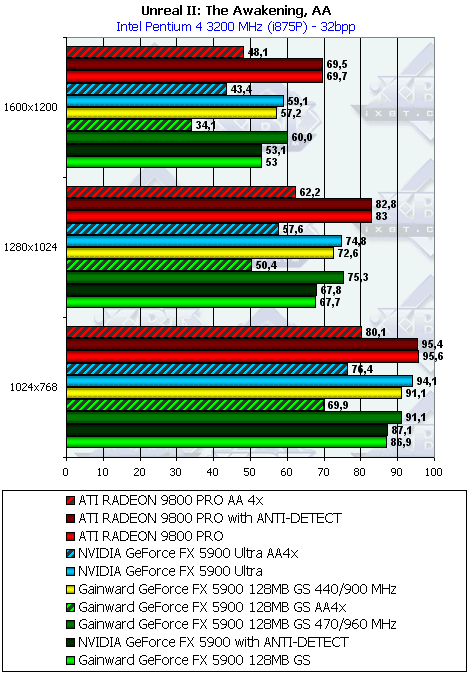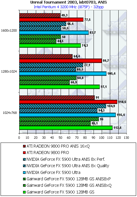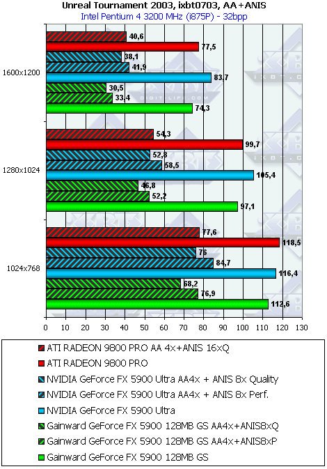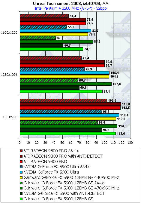 Остались игровые тесты. На примере UT2003 вы узнаете, что и тут программисты NVIDIA решили поднять скорость своего детища нечестным способом сделать «заточку» под демку-бенчмарк в игре. Мы уже обсуждали, что само изготовление оптимизаций под ИГРУ, когда с ростом скорости нет падения в качестве, это замечательно! С этим никто не спорит. Но «затачивать» только под демку-бенчмарк (например, DM-Antalus FlyBy), когда скорость растет ТОЛЬКО в этом бенчмарке, а в самой игре нет, это безобразие!
