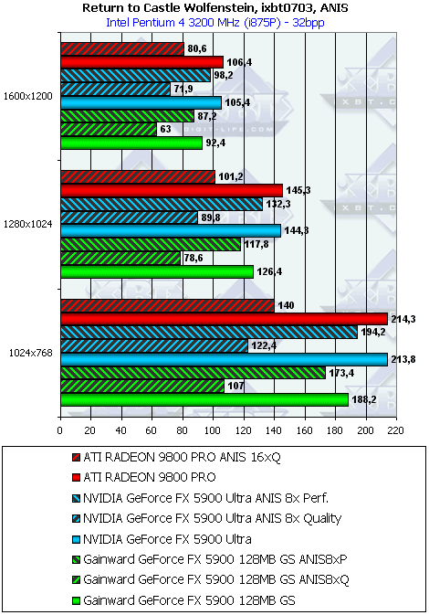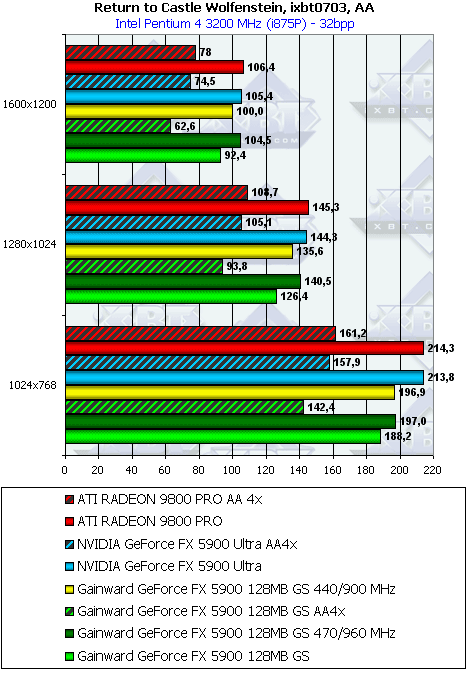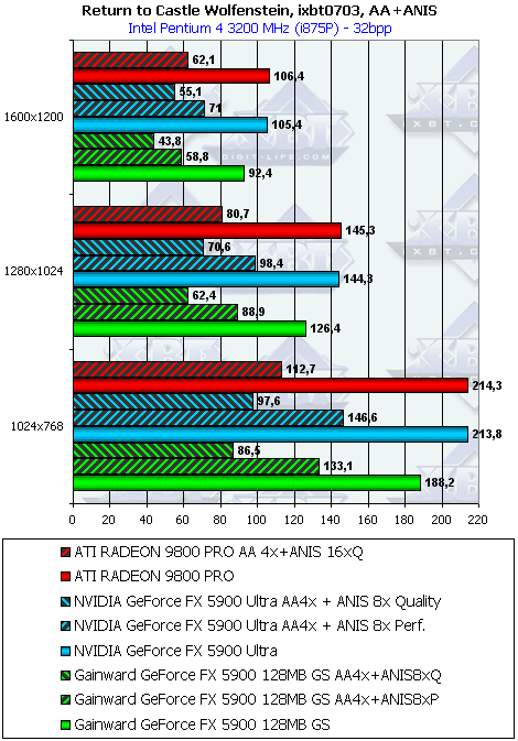 - Return to Castle Wolfenstein (MultiPlayer) (id Software/Activision) OpenGL, мультитекстурирование, ixbt0703-demo, настройки тестирования все на максимально возможном уровне, S3TC OFF, конфигурации можно скачать тут