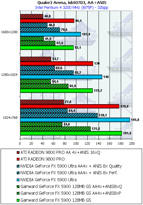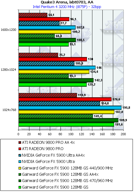 - Quake3 Arena v.1.17 (id Software/Activision) OpenGL, мультитекстурирование, ixbt0703-demo, настройки тестирования все на максимальном уровне: уровень