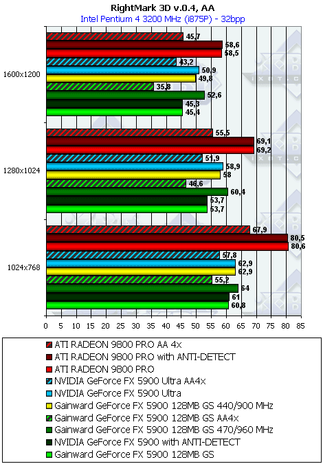 Увы, это может быть печально кому-то слышать, но это так. Конечно, разница подчас не столь критична и фатальна, но тесты с широко используемыми шейдерными технологиями показывают, что перспектива у RADEON 9800 PRO иметь более высокие скорости в будущих играх, выше, чем у FX 5900. Что касается старых тестов типа Quake3 и RtCW, то ранее очень приятные для поклонников NVIDIA результаты померкли. Да, снова «заточки» (хотя доказать напрямую пока невозможно, нет Anti-Detect-а под OpenGL).