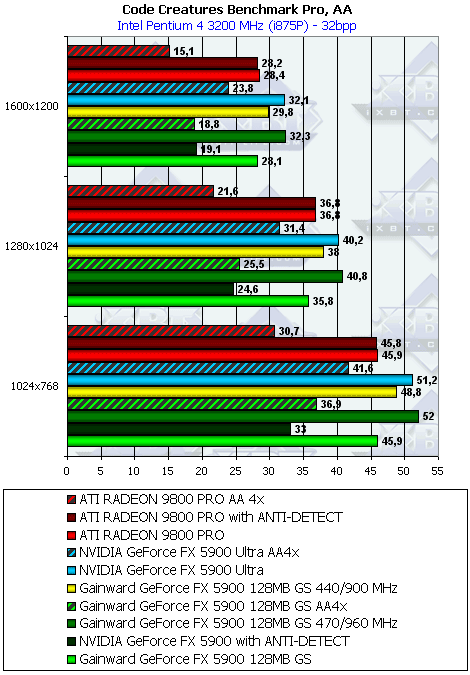 Здесь мы имеем сказать следующее. Во-первых, определение «заточек» продемонстрировало, что NVIDIA в данном бенчмарке весьма серьезно подошла «к делу» и +30% скорости получились весьма блестяще. Во-вторых, без «заточек» FX 5900 проиграл вчистую (что, собственно, и следовало ожидать, ведь по скорости работы шейдеров все новинки NVIDIA не блещут, а Code Creatures очень активно использует шейдеры). К сожалению, в данной программе невозможно снять два одинаковых скриншота (это rolling demo, интерактивности нет), поэтому сравнить качество с «заточками и без» не получится. Но даже если и есть некие полезные оптимизации, помогающие поднять скорость при отсутствии падения качества, то имело бы смысл говорить об этом, если бы данное приложение было бы игрой. Но так как это целиком и полностью бенчмарк (пусть и на игровом движке), то осуществлять подмены и заставлять работать тест не так, как он задумывался авторами некрасиво. К чести ATI надо сказать, что заточек под данный тест у RADEON-ов не обнаружено!