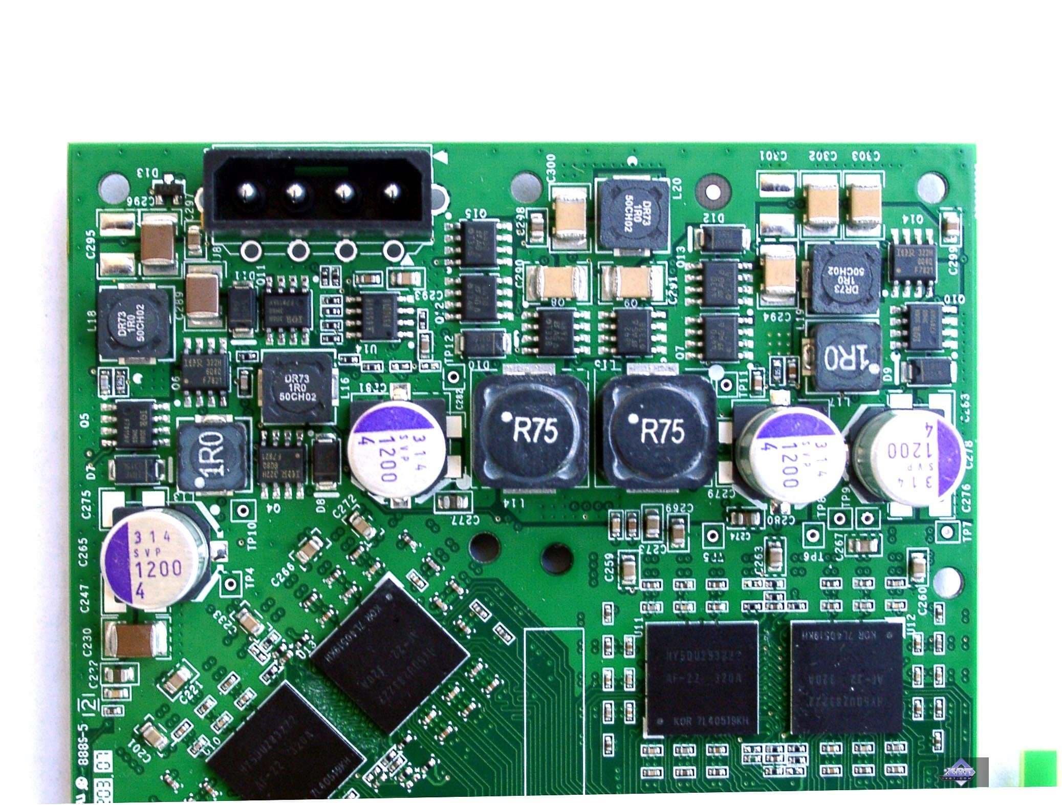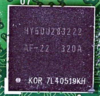 | Микросхемы памяти производства Hynix. Время выборки у микросхем памяти 2.2ns, что соответствует частоте работы примерно 454 (908) МГц, память же работает на частоте 425 (850) МГц. Частота работы GPU 450 MHz. Интерфейс обмена с памятью 256 бит. | ![]() |