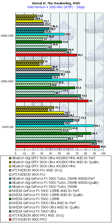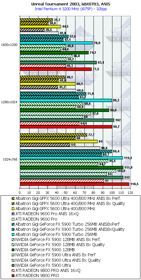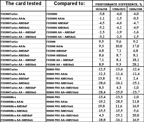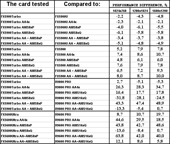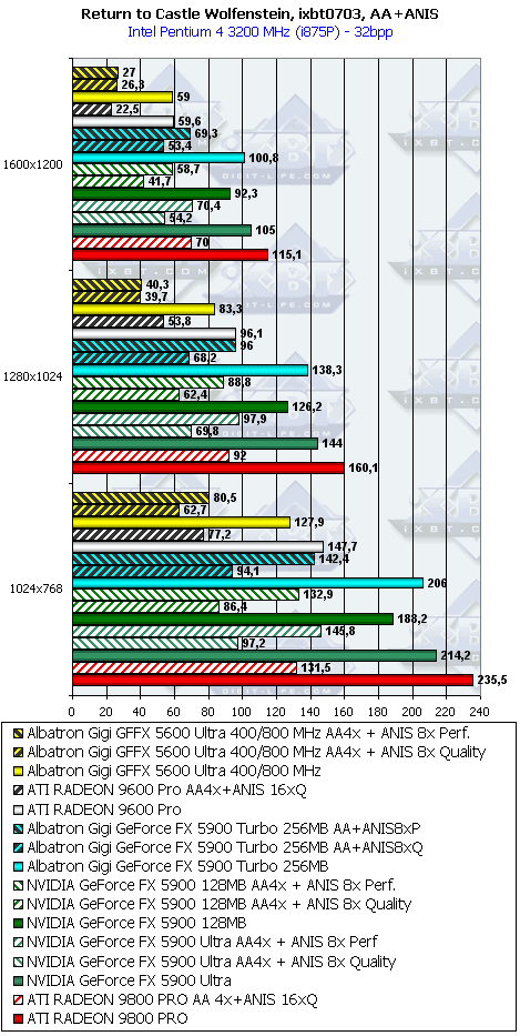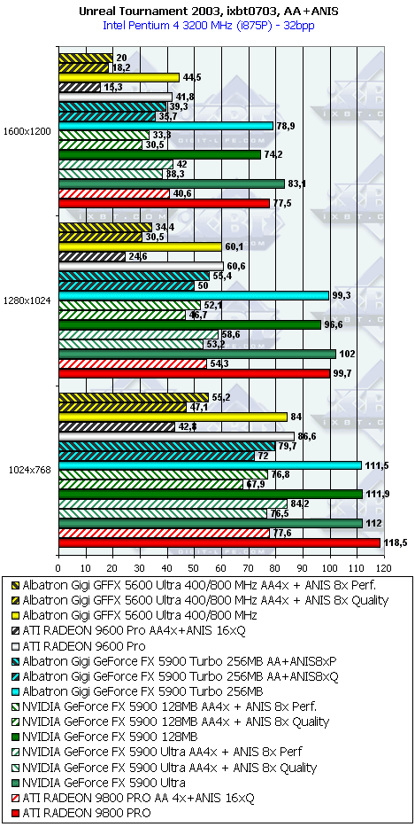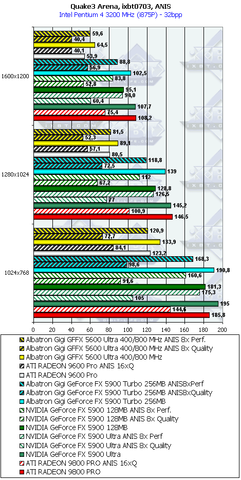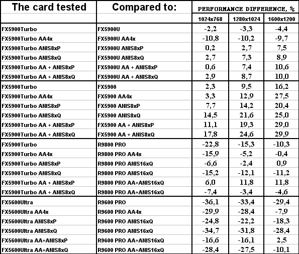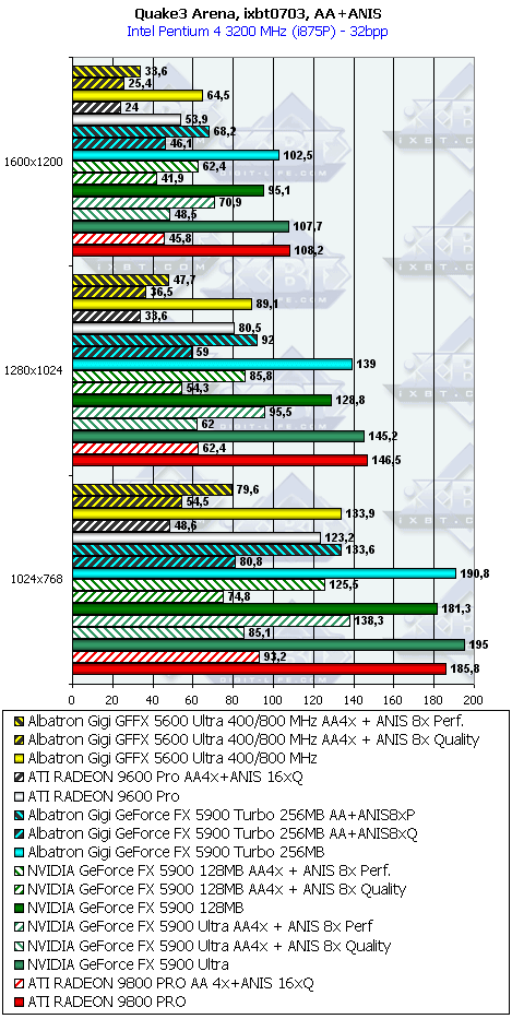 Прежде всего, видно мизерное отставание 5900Turbo от «ультры», а также небольшое превосходство над FX5900, чего и следовало ожидать. Что касается соперничества с продуктом от ATI, то перевес есть в АА, а также в режимах с анизотропией уровня Performance. При Quality карта от Albatron отстает. Поэтому в целом небольшое преимущество продукта от NVIDIA.