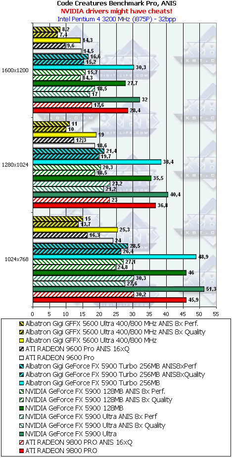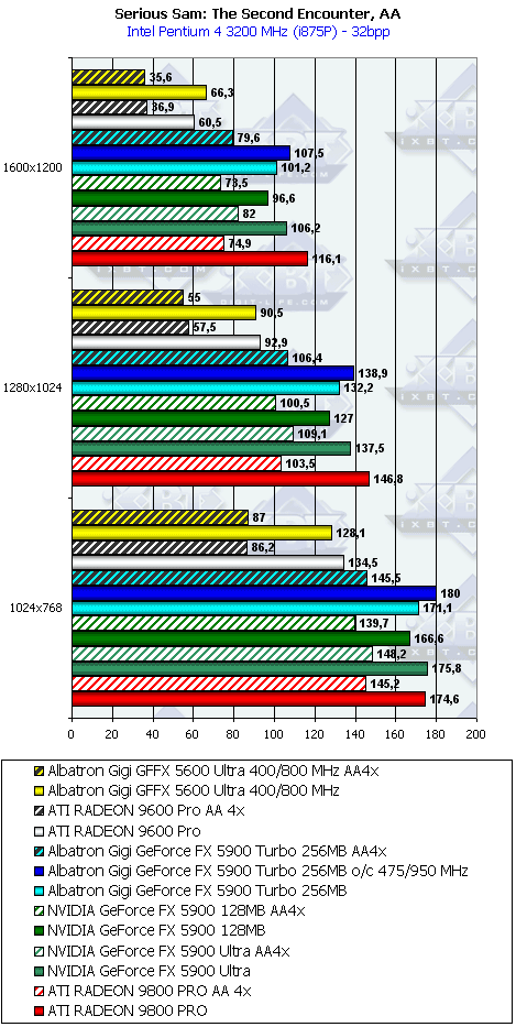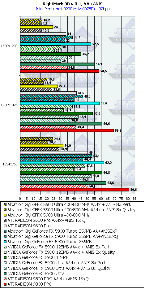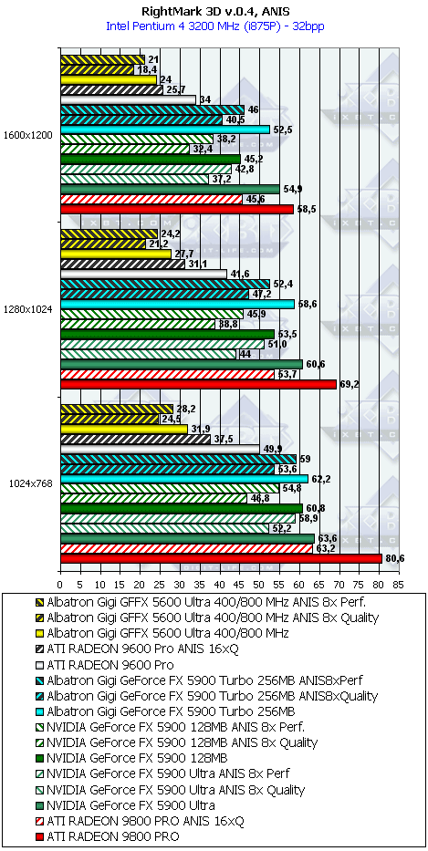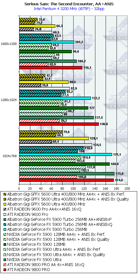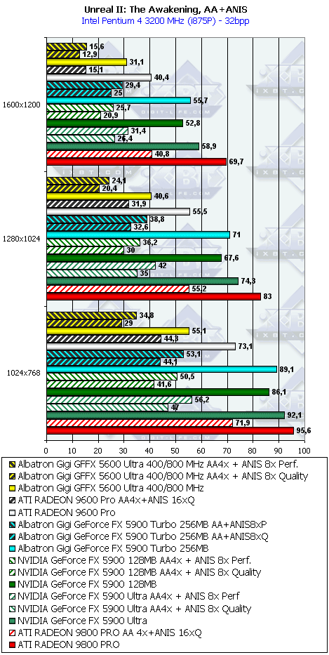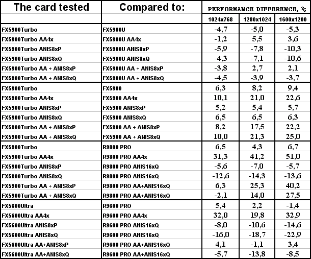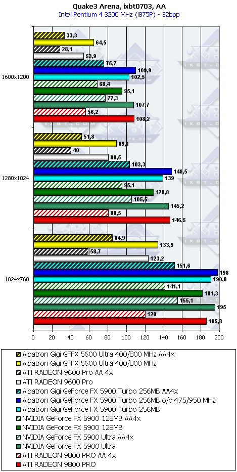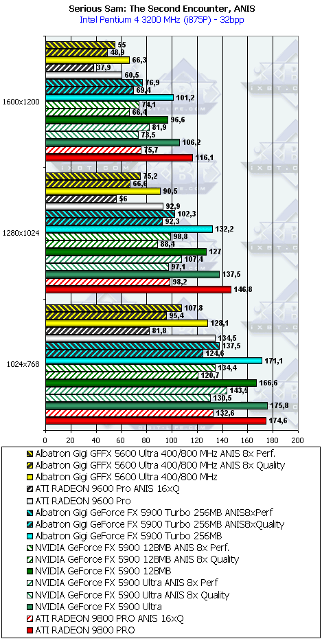 Прежде всего, видно мизерное отставание 5900Turbo от «ультры», а также небольшое превосходство над FX5900, чего и следовало ожидать. Что касается соперничества с продуктом от ATI, то перевес есть в АА, а также в режимах с анизотропией уровня Performance. При Quality карта от Albatron отстает. Поэтому в целом небольшое преимущество продукта от NVIDIA.
