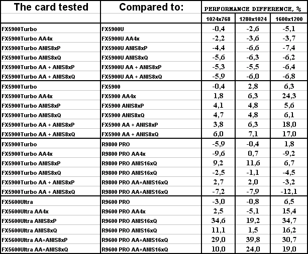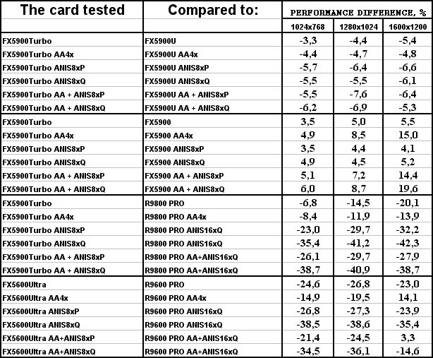 Думаю, что нет смысла больше рассказывать, как 5900 Turbo соотносится с 5900 и 5900 Ultra, это и так очевидно. А вот сопернику из стана ATI наша карта проиграла в большинстве случаев.