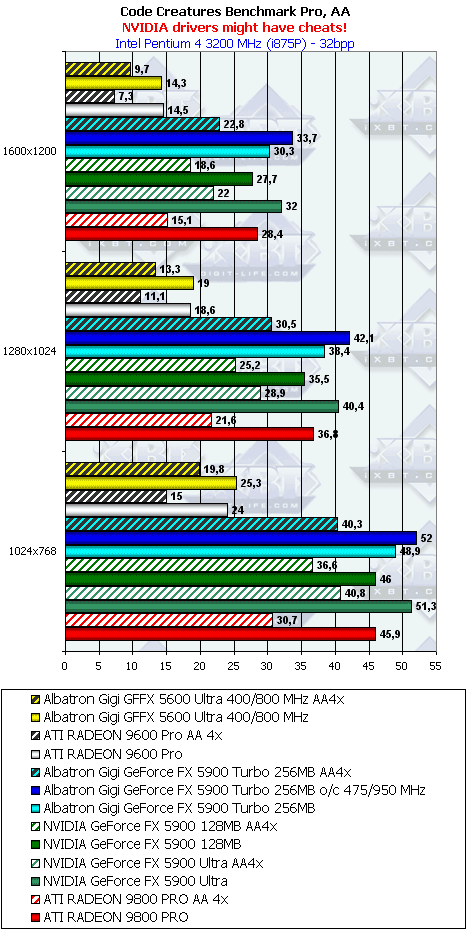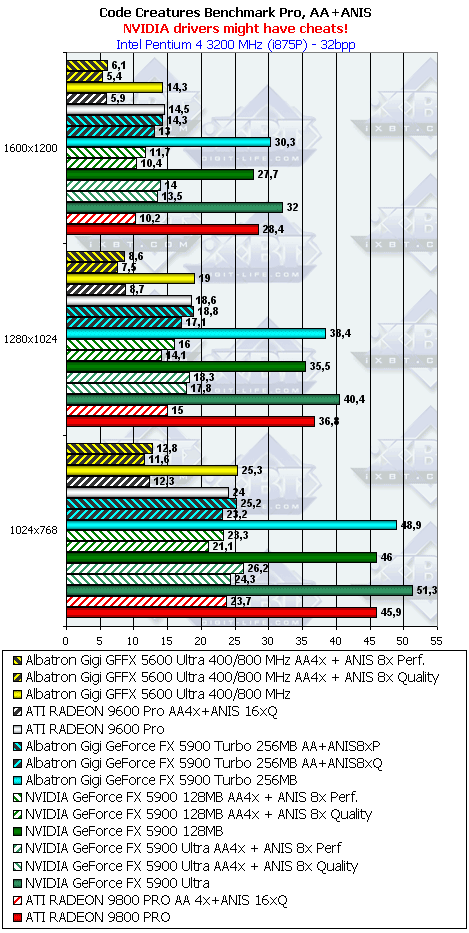 Расклад старшего детища Albatron между 5900 и 5900 Ultra точно такой же. А вот состязание с конкурентом окончилось, по сути, вничью (если все плюсы и минусы усреднить).