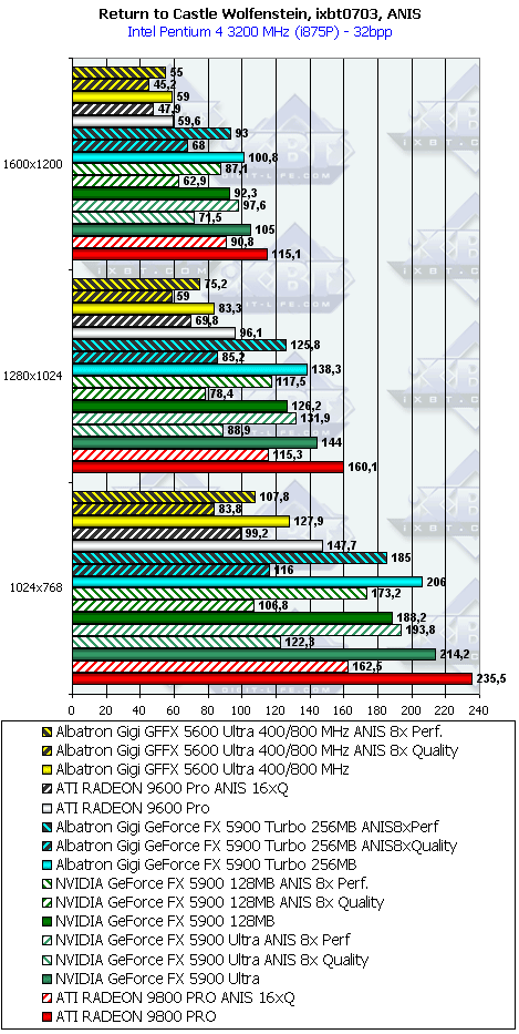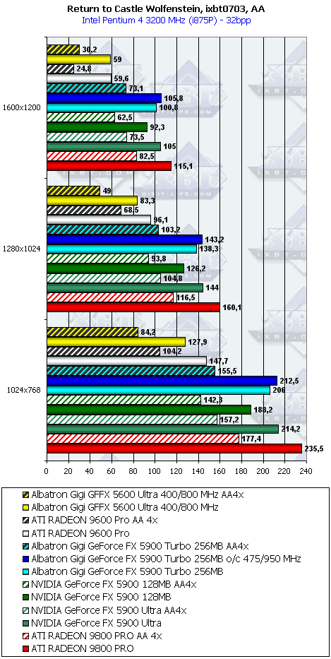- Return to Castle Wolfenstein (MultiPlayer) (id Software/Activision) OpenGL, мультитекстурирование, ixbt0703-demo, настройки тестирования все на максимально возможном уровне, S3TC OFF, конфигурации можно скачать тут