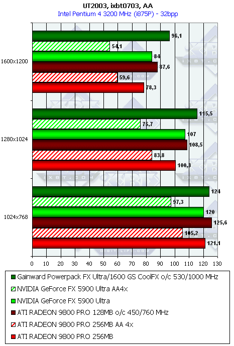 - ATI: полноценная анизотропия с трилинейкой работают ТОЛЬКО при выставлении оной в самой игре, а это надо руками править ut2003.ini, что догадается сделать не каждый геймер. Неприятно, даже если иметь в виду объяснения специалистов ATI по этому поводу.
