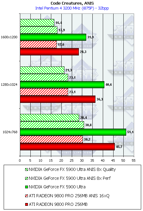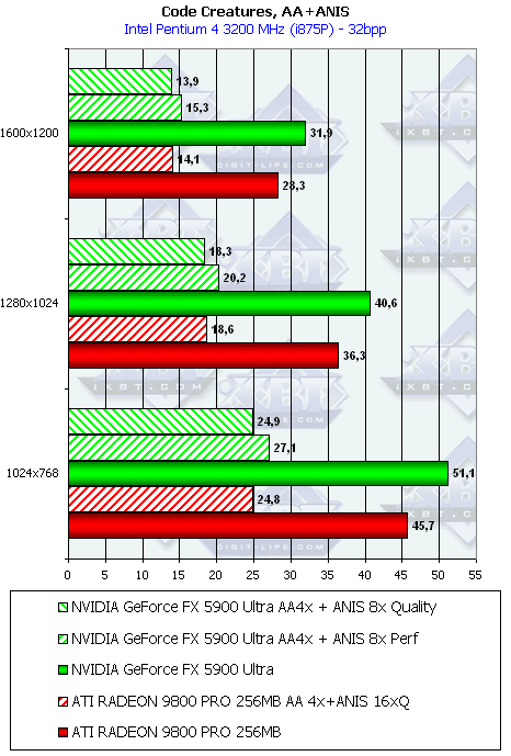 Что касается скоростей, то тут FX 5900 Ultra по-прежнему немного в проигрыше, хотя и в меньшей степени чем ранее. Интересно, достигли оптимизации и этой игры? Засчет чего-то скорость-то выросла на 51.75.