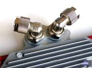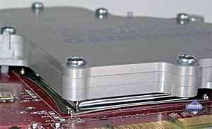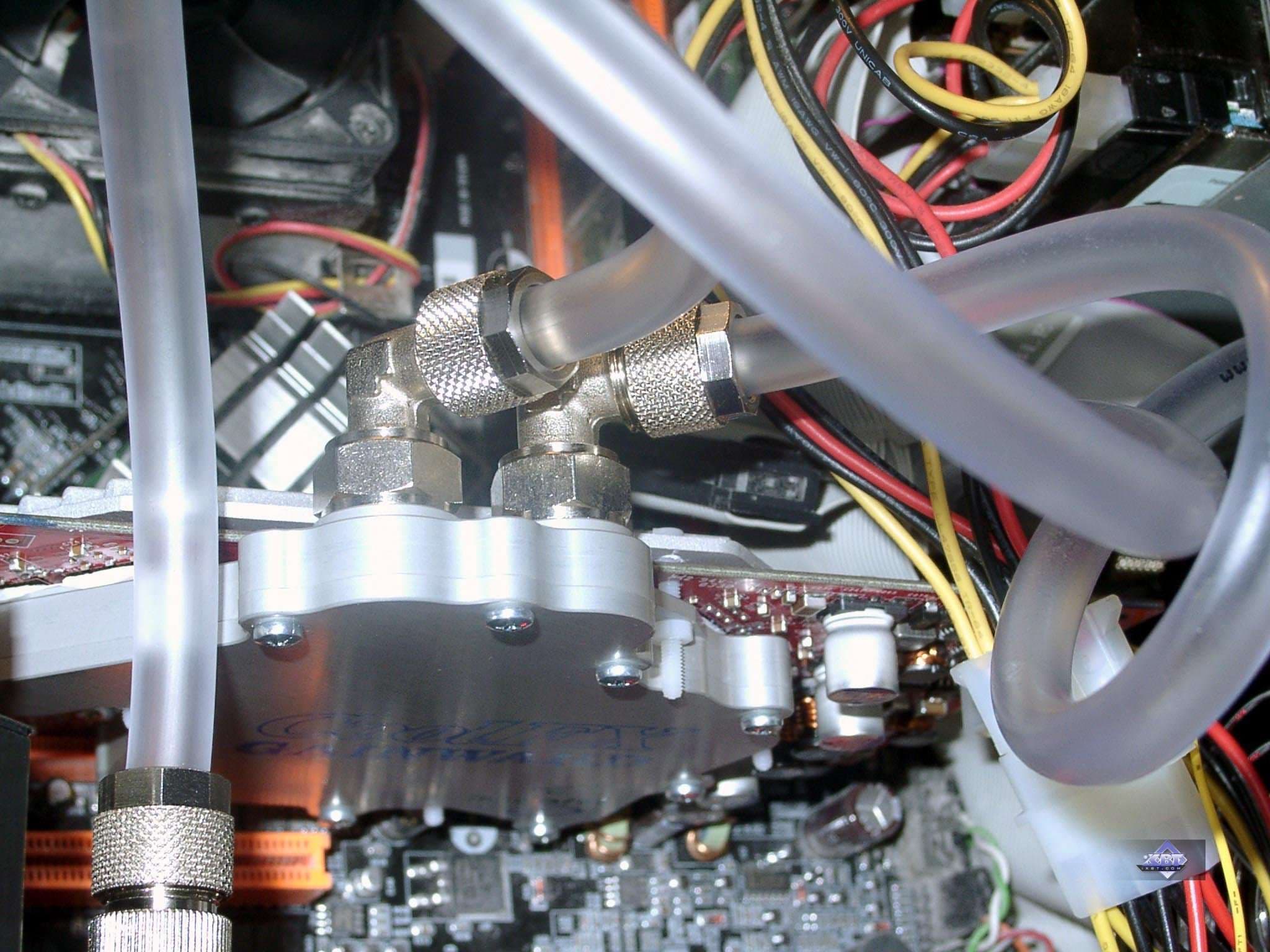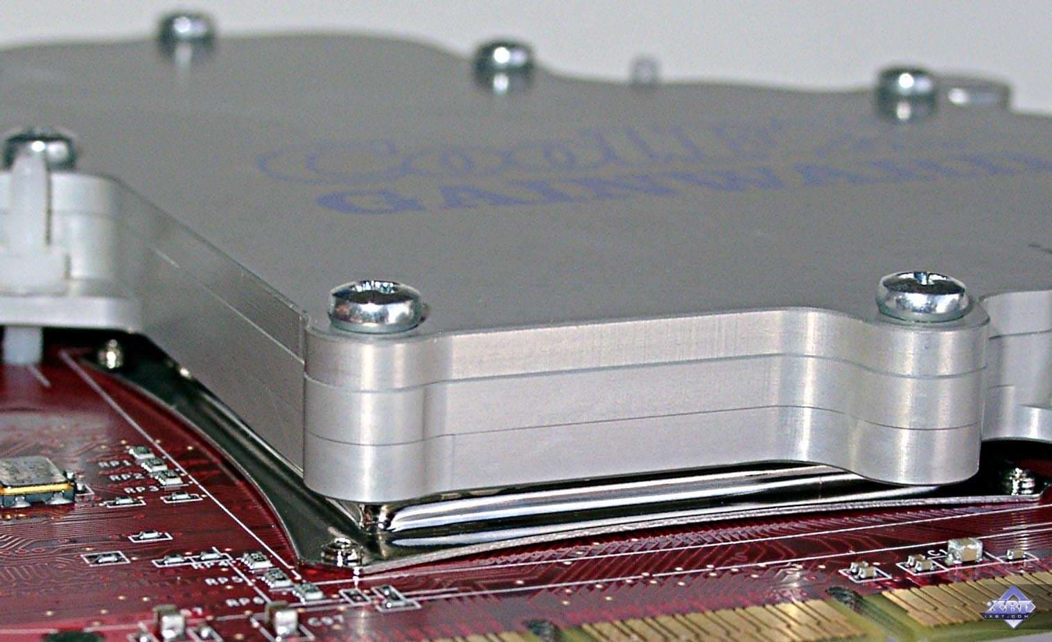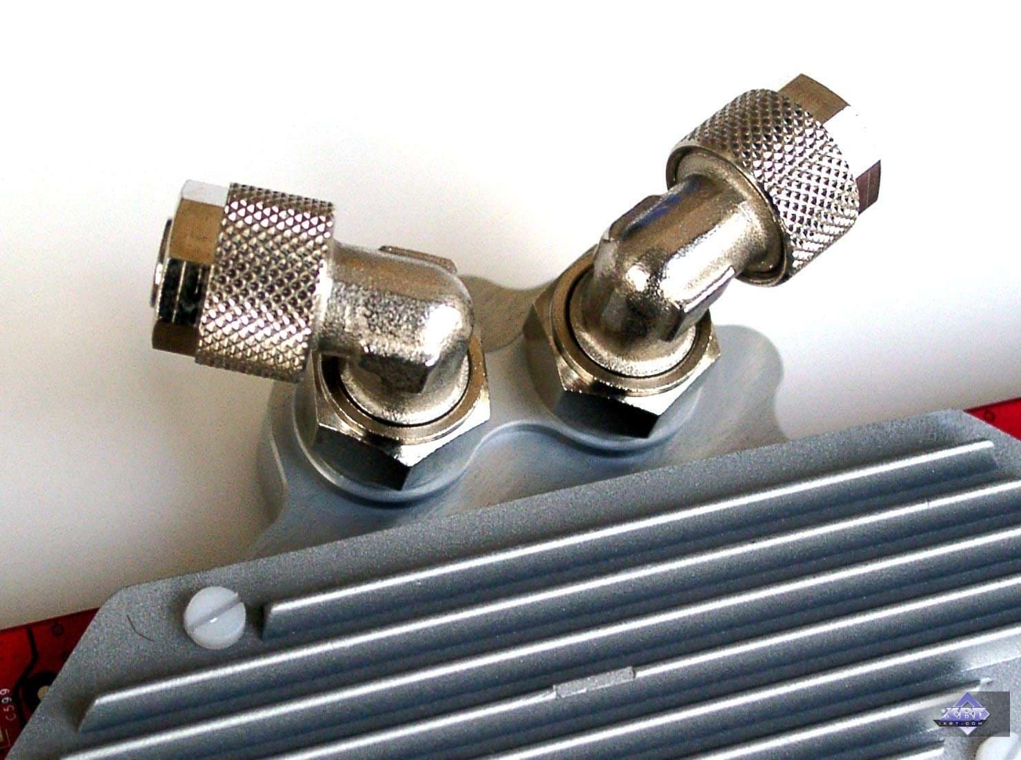 Сам кулер на плате — это закрытая емкость, покрывающая ядро и микросхемы памяти, внутри которой должна циркулировать охлаждающая жидкость. Сверху кулера есть два патрубка для подвода и вывода жидкости.