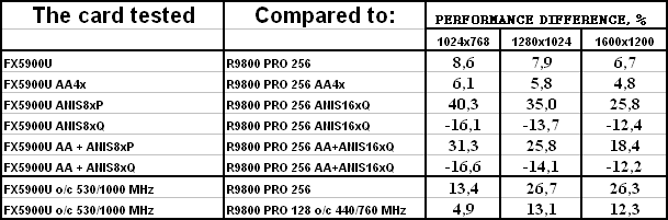 Победа 5900Ultra в данном тесте была давно. И мы знаем почему: оптимизации. Последние официальные ответы NVIDIA гласят, что оптимизации возможны везде и вся, хоть игра, хоть бенчмарк, если это приложение популярно. По их словам, раз потерь в качестве нет, то и волноваться незачем. Потерь в качестве от этих оптимизаций действительно нет. Поэтому мы рассматриваем уже просто как факт, что у 5900 Ultra в данном тесте лидерство.