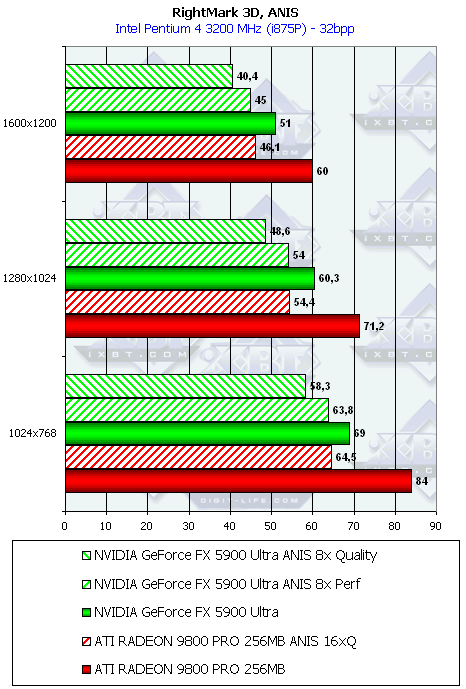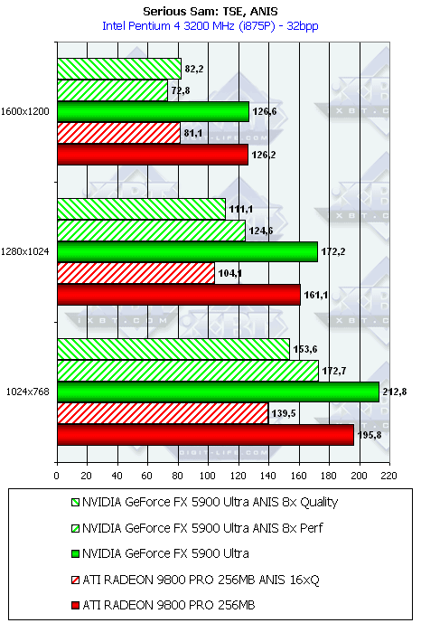 Вроде все на своих местах, трилинейка есть (хотя как мне кажется, все же она чуть упрощена у FX 5900). Отличий у NVIDIA без форсированием анизотропии и ее включением в игре — нет. А вот у ATI небольшое есть.
