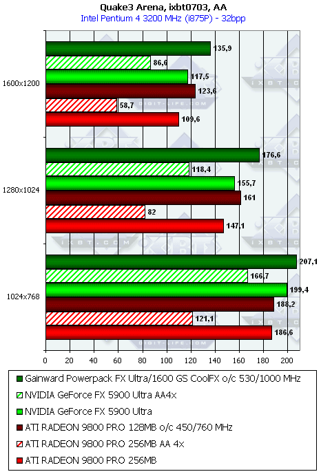 - Quake3 Arena v.1.17 (id Software/Activision) OpenGL, мультитекстурирование, ixbt0703-demo, настройки тестирования все на максимальном уровне: уровень