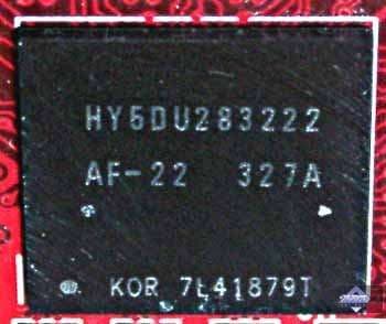 | Микросхемы памяти производства Hynix. Время выборки у микросхем памяти 2.2ns, что соответствует частоте работы примерно 454 (908) МГц, память же работает на частоте 425 (850) МГц. Частота работы GPU 450 MHz. Интерфейс обмена с памятью 256 бит. При установке фирменной утилиты согласно «законам Golden Sample» частоты уже выше — 500/900 МГц. | ![]() |