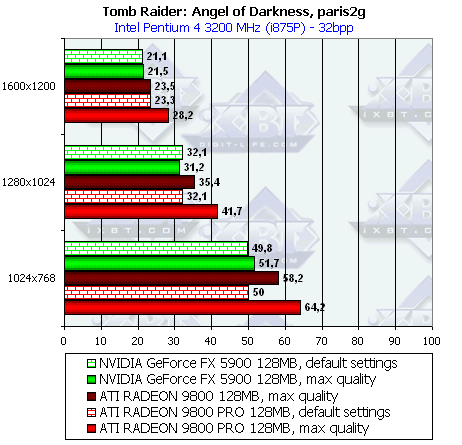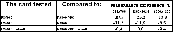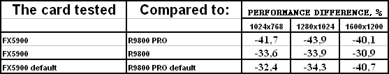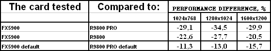 Обратим внимание на то, что в сцене, где почти не используются шейдерные технологии, поражение у FX 5900 почти отсутствует (а при настройках по умолчанию, скорости у GFFX и R9800 PRO одинаковые). Да, это уже где-то постулат: Чем больше шейдеров в игре, тем слабее себя показывают GeForce FX. ![]()