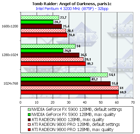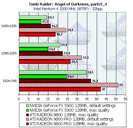 Однако отметим и некую странность, которая в данном тесте усилилась: скорость у RADEON 9800 PRO при максимальном качестве — ВЫШЕ, чем при настройках по умолчанию. Эти данные перепроверялись, они точные. Вероятно, какая-то недоработка в самой игре.