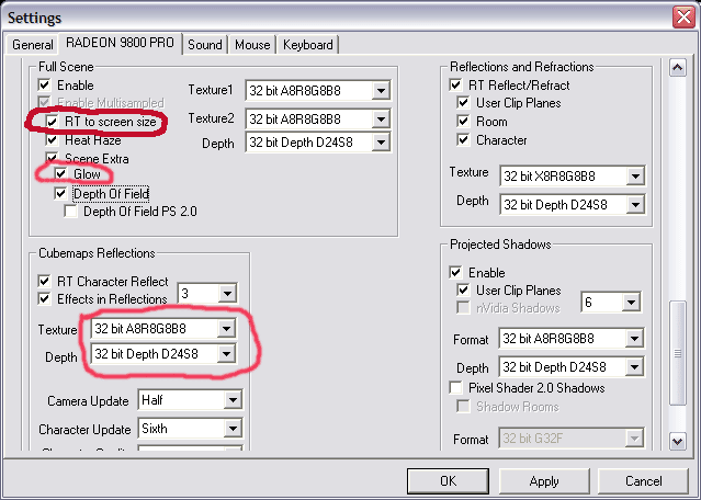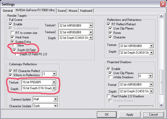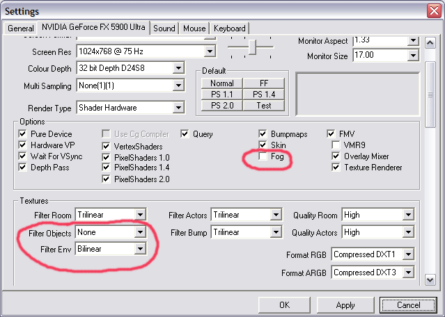 Замечу сразу, что во избежание путаницы с настройками игры для RADEON 9800 PRO и GeForce FX 5900 в целях чистоты эксперимента после тестирования карт из каждого «клана» игра инсталлировалась заново, и ставился патч 49. И еще одно важное примечание: при детекте игрой RADEON 9800 PRO и GeForce FX 5900 настройки по умолчанию были ТАКЖЕ ОДИНАКОВЫМИ и они приведены выше.