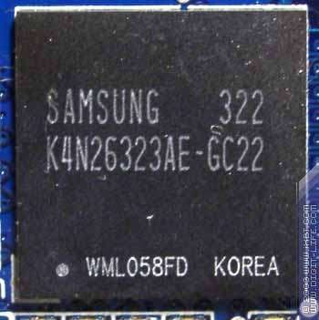 | Микросхемы памяти Samsung (GDDR2). Время выборки у микросхем памяти 2.2ns, что соответствует частоте работы 450 (900) МГц, на которой память и работает. Частота работы GPU 475 MHz. Шина обмена с памятью — 128 bit. | ![]() |