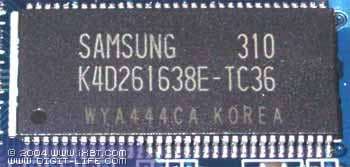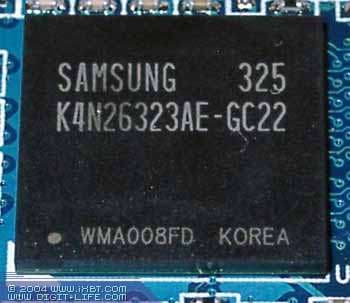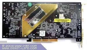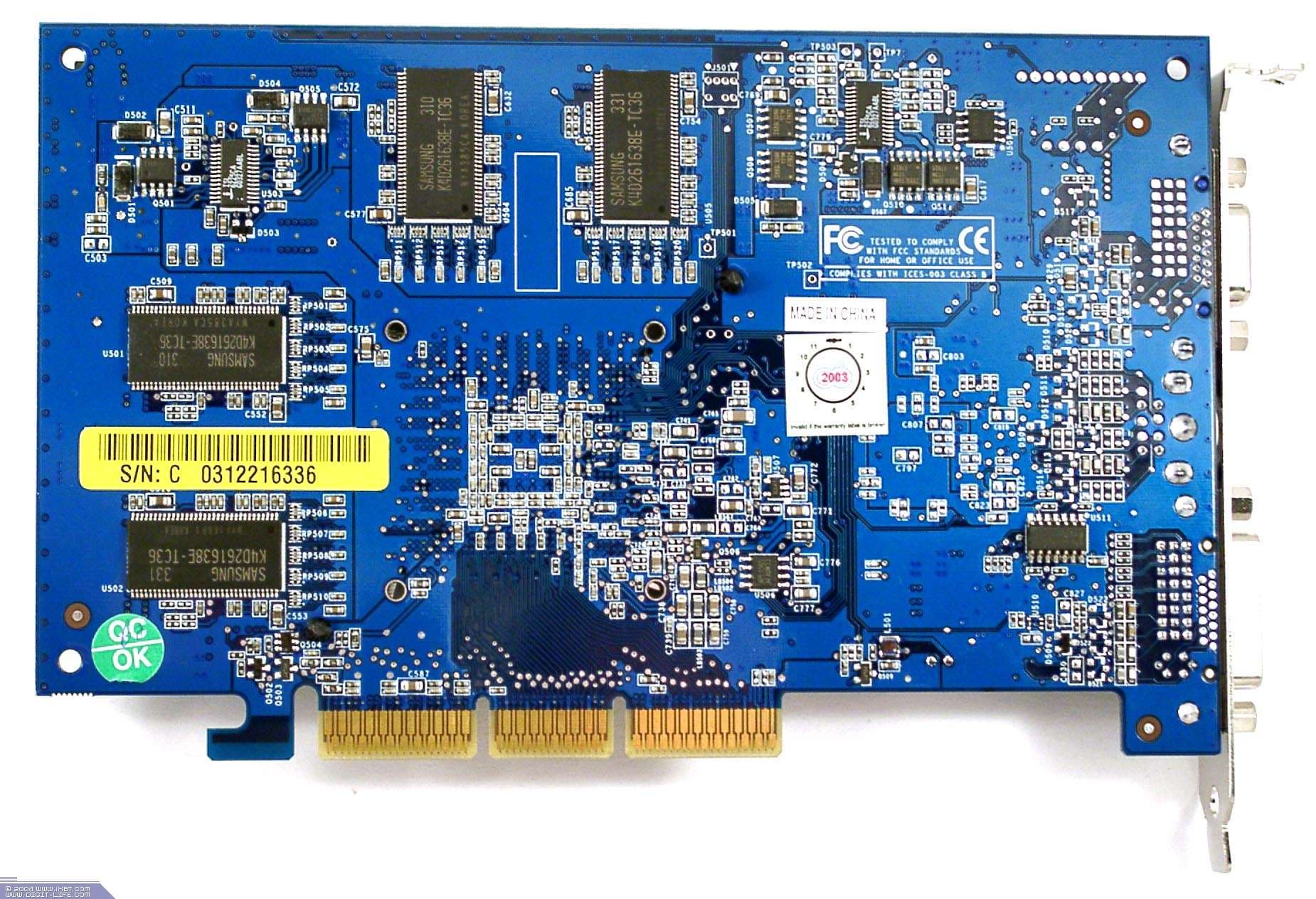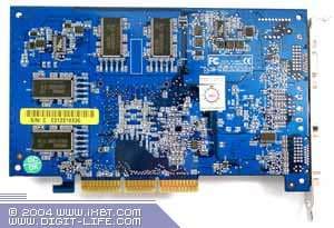| Карта имеет интерфейс AGP x8/x4/x2, 128 МБ памяти DDR SDRAM, размещенной в 8-ми микросхемах на лицевой и оборотной сторонах PCB. Микросхемы памяти производства Samsung. Время выборки у микросхем памяти 3.6ns, что соответствует частоте работы 275 (550) МГц, на которой память и работает. Частота работы GPU 425 MHz. Интерфейс обмена с памятью 128 бит. | ![]() |