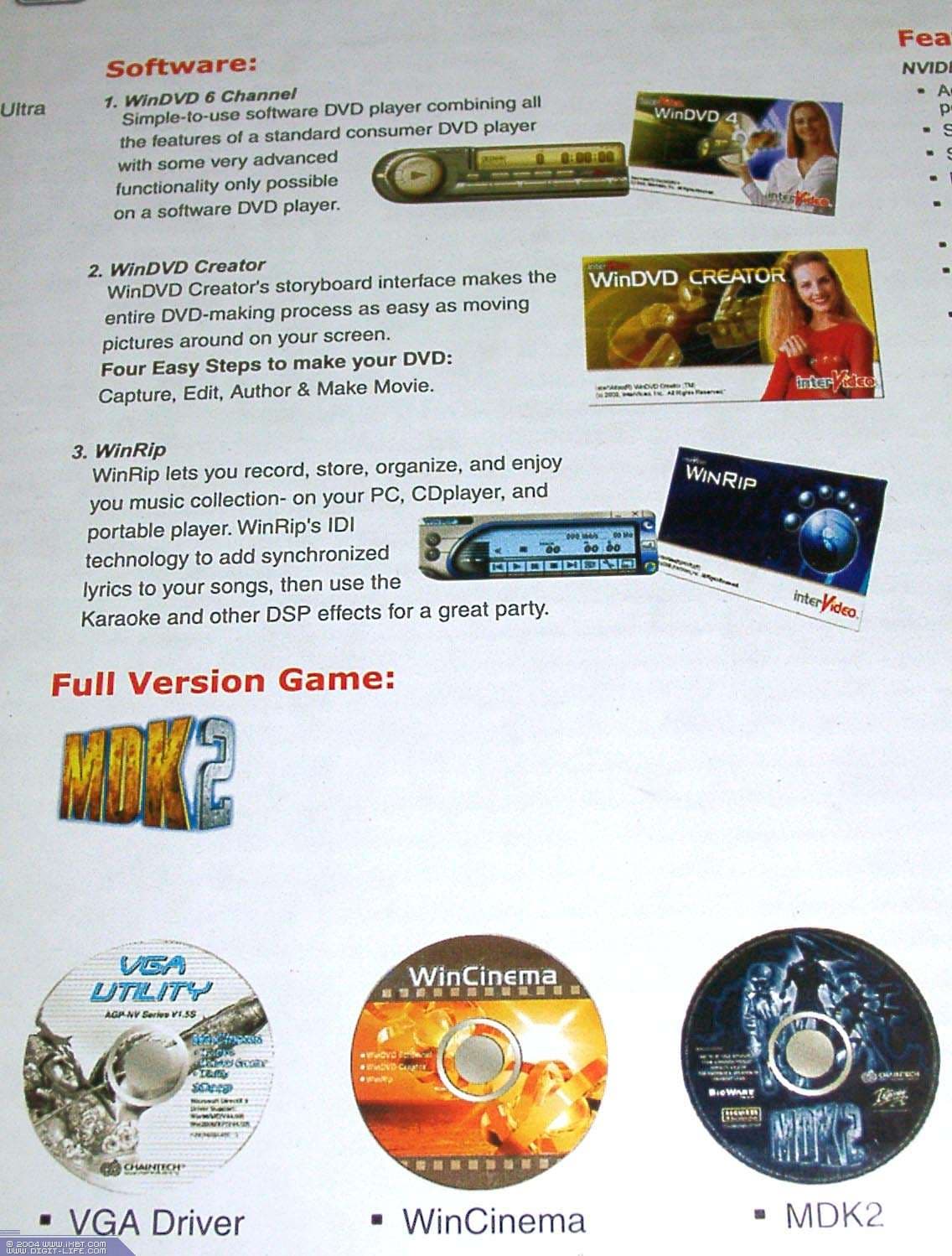 - Chaintech FX5700 Ultra Apogee AA5700U как бы свой High-End в Middle-секторе. Понятно, что выпуск нацелен на привлечение покупателей. Но снова повторю, что пока на рынке много дешевых FX 5900XT, которые точно более мощные, чем FX 5700 Ultra, то успех у последних — очень призрачен. Он придет только после пропадания 5900ХТ с рынка. Что касается самой карты, то компания постаралась выпустить очень добротный продукт. Жалко лишь, что при такой комплектации он не обладает VIVO. Не забываем, что все очевидней угроза со стороны ATI снизить цены на RADEON 9800, по сравнению с которыми FX 5700 Ultra явно в проигрыше по всем статьям (ведь даже FX 5900XT уступает).