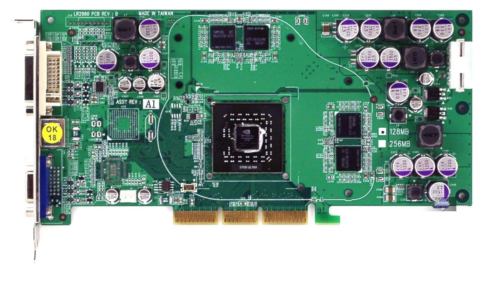 | Карта базируется на GeForce FX 5700 Ultra, имеет интерфейс AGP x8/x4/x2, 128 МБ памяти GDDR3 SDRAM , размещенной в 4-х микросхемах на лицевой стороне PCB. Микросхемы памяти производства Samsung. Время выборки у микросхем памяти 2 ns, что соответствует частоте работы 500 (1000) МГц, память же работает на частоте 475 (950) МГц. Частота работы GPU 475 MHz. Шина обмена с памятью 128 bit. | ![]() |
