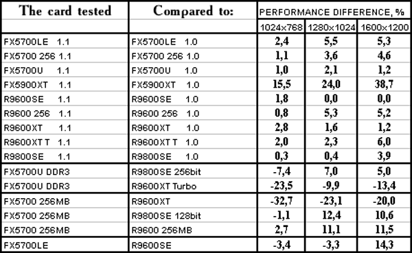 Итак, как мы видим, приростов производительности версия 1.1 практически не дала, кроме семейства FX 5900 (на примере FX 5900XT). Но зато там скорость выросла основательно. И при этом качество не пострадало (да, изменилось что-то, но в какую сторону? Вряд ли это можно назвать потерей.)