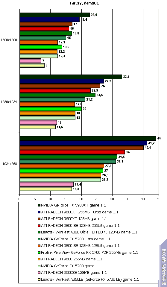Вернемся к теме. Сегодня, помимо трех вышеуказанных карт, мы разберем работу ускорителей в новой игре FarCry. В прошлый раз мы рассматривали лишь DEMO-версию, а сегодня протестируем карты в финальной игре. Авторы продукта также являются участниками программы NVIDIA, поэтому интересно будет посмотреть на то, что даст недавно вышедший патч 1.1 для ускорителей серии GeForce FX.