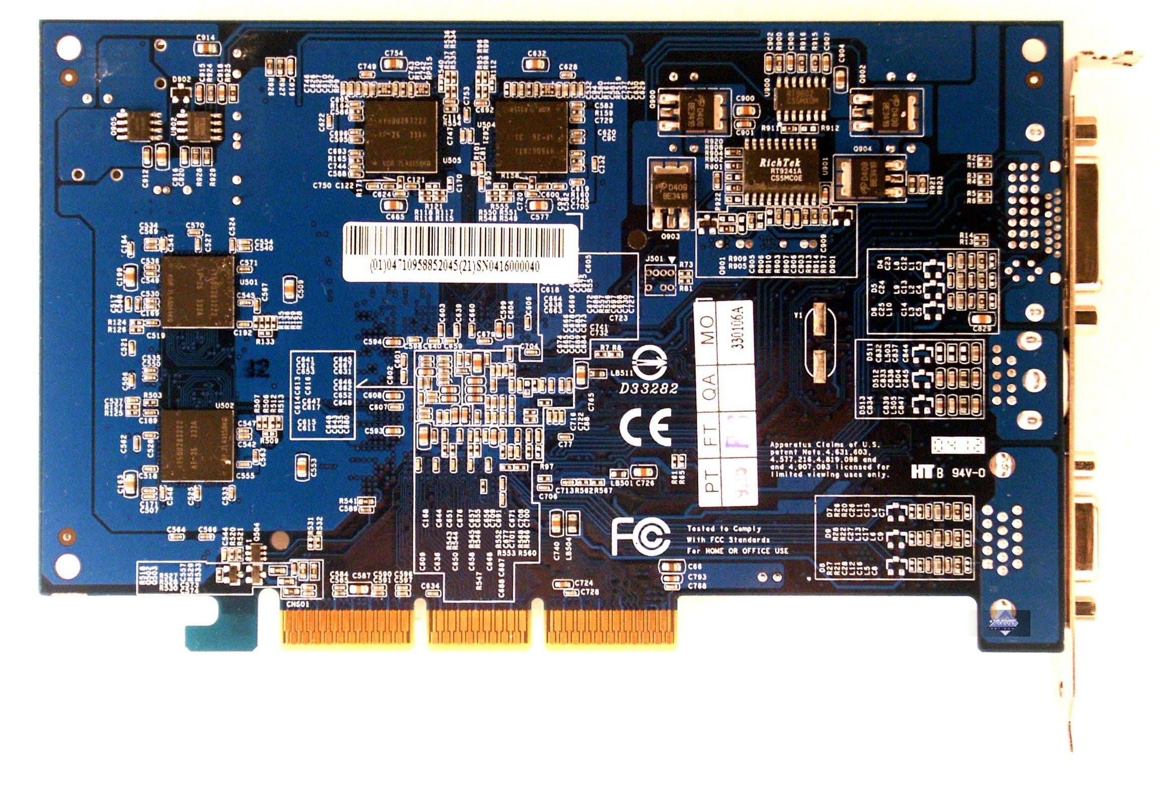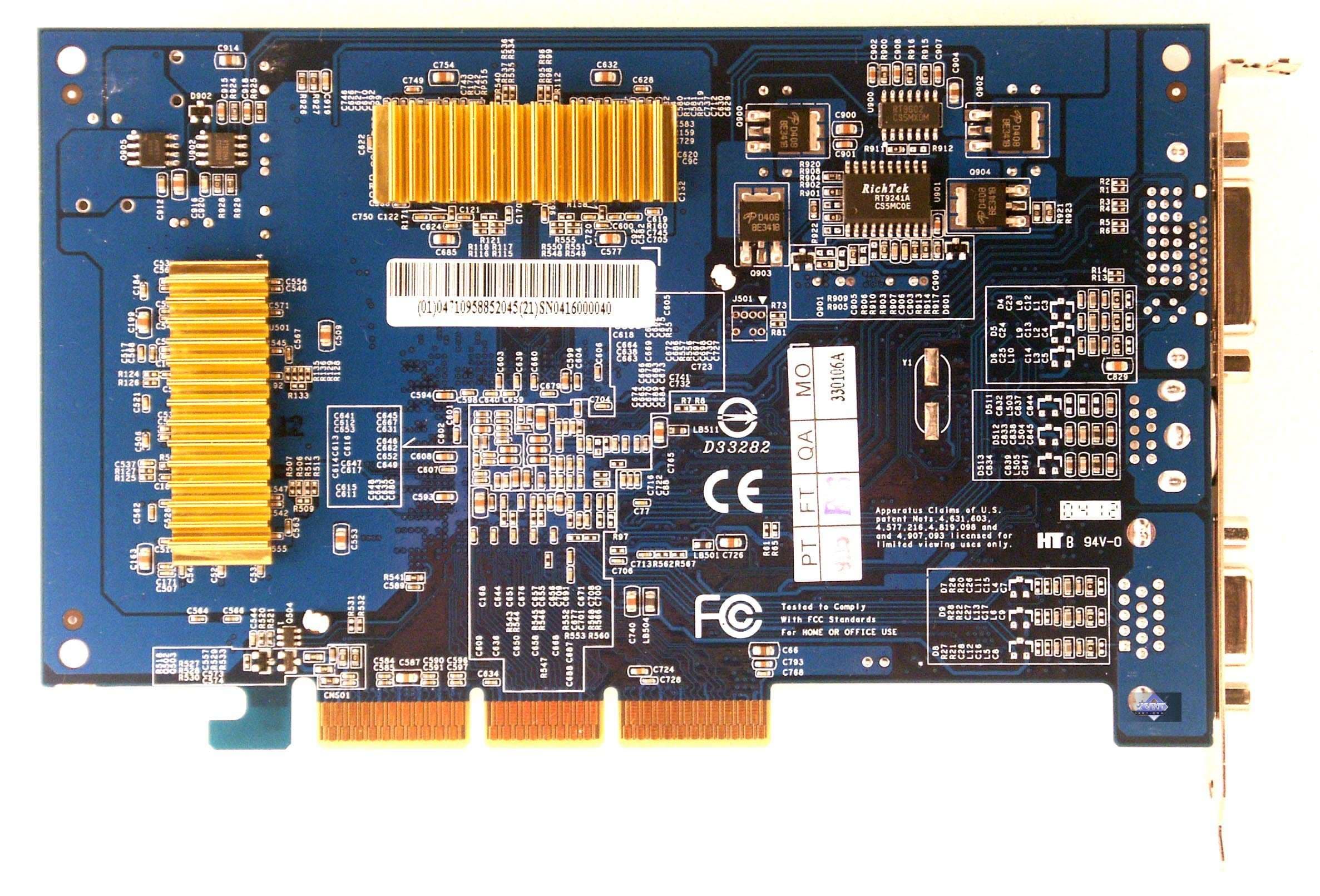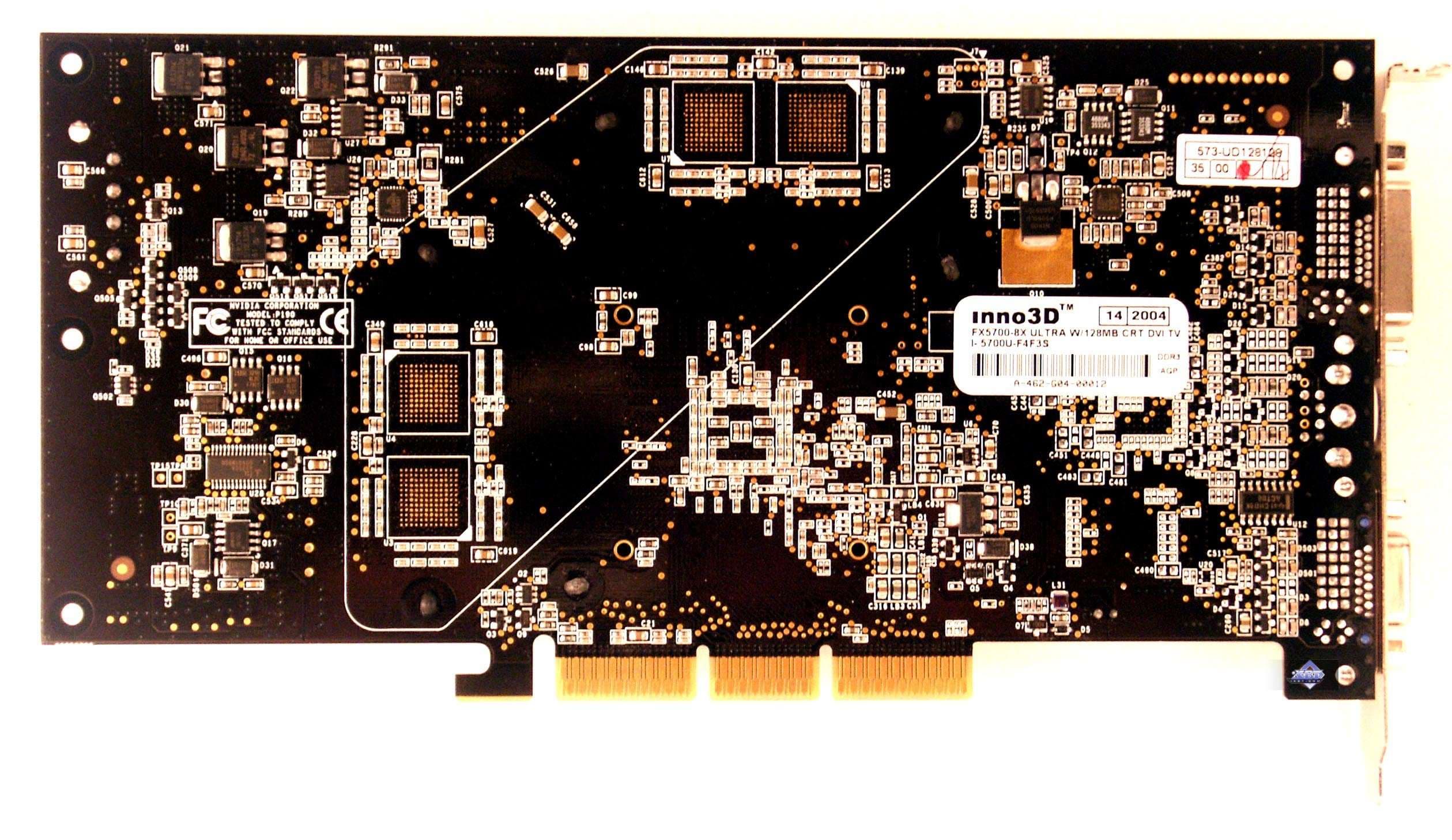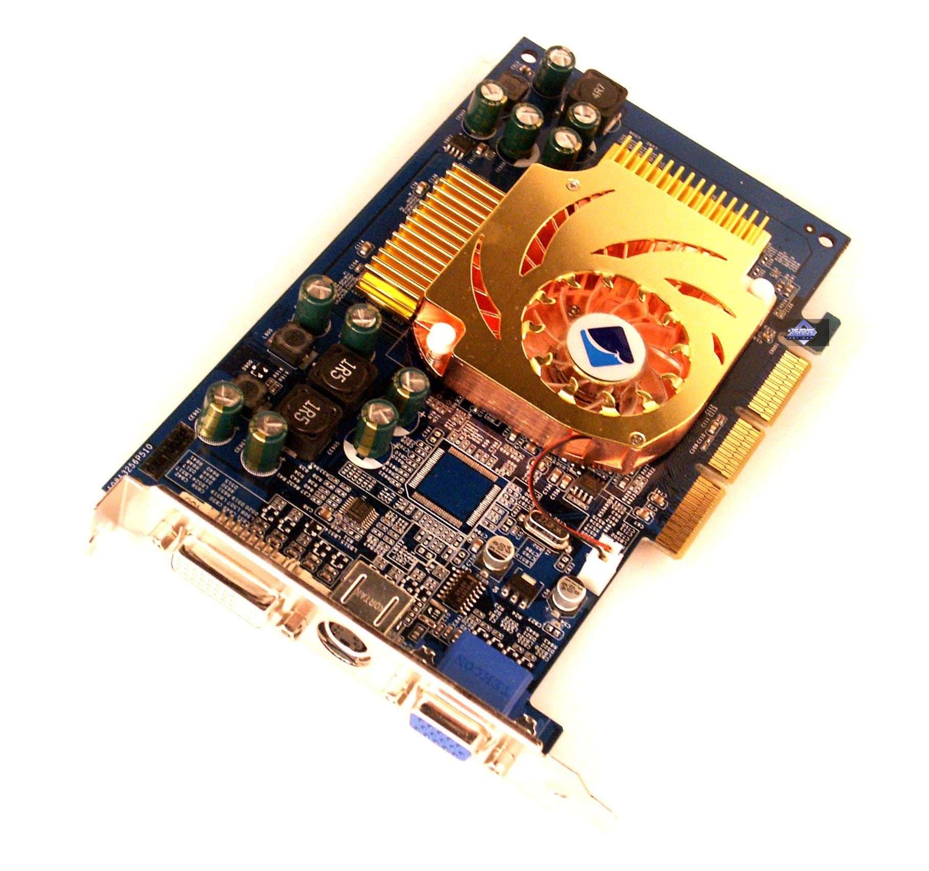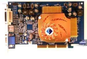 | Карты имеют интерфейс AGP x8/x4/x2, 128 МБ памяти GDDR3, размещенной в 4-х микросхемах на лицевой стороне PCB. Микросхемы памяти Samsung (GDDR3). Время выборки у микросхем памяти 2.0ns, что соответствует частоте работы 500 (1000) МГц, память же работает на частоте 475 (950) МГц. Частота работы GPU 475 MHz. Шина обмена с памятью 128 bit. | ![]() |