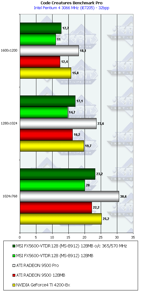 - Code Creatures Benchmark Pro (CodeCult) игровой тест, демонстрирующий работу платы в DirectX 8.1, Shaders, HW T&L.
