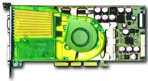 Кстати, можно оценить и размер кристалла. И раз уж мы заговорили о чипе, то скажем, что, в отличие от ATI R300, кристалл покрыт цельнометаллической крышкой, защищающей его от сколов и играющей роль дополнительного радиатора. А упаковка кристалла такая же — FCPGA.