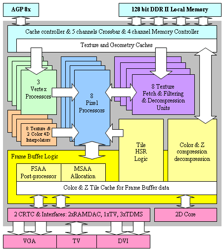 - Pixel Processors пиксельные процессоры, исполняют пиксельные шейдеры и эмулируют пиксельные стадии. Осуществляют закраску пикселей и формируют запросы к блокам выборки текстур.
