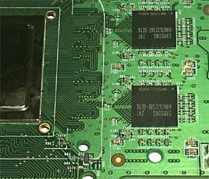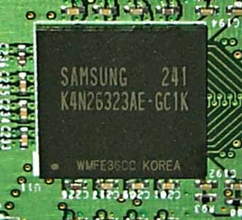 | На карте установлены микросхемы памяти Samsung марки K4N26323AE-GC1K, форм-фактора BGA. Максимальная частота работы — 550 (1100) МГц, поэтому можно сделать вывод, что время выборки 1.8 нс. По умолчанию память работает в 3D на частоте 500 (1000) МГц, в 2D — 300 (600) МГц. | ![]() |