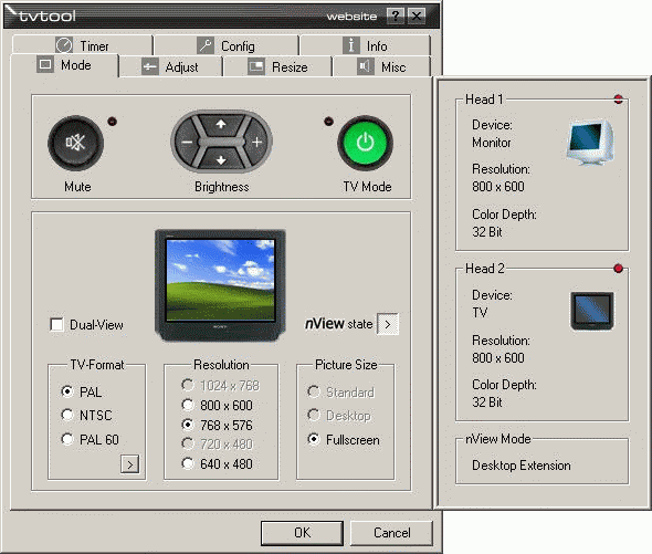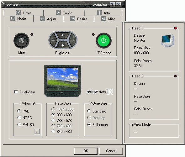 Естественно, мы не могли обойти своим вниманием давно ожидаемое многими событие обновившаяся до версии 7.2.5 утилита TVTool наконец-то обзавелась полноценной поддержкой технологии nView (не забудьте только на картах с внешними чипами!). Попробуем разобраться, как же это реализовано. На панели Mode можно увидеть кнопку nView state,