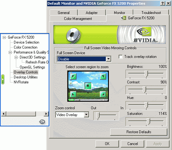 Первыми полноценную поддержку её получили карты на GeForce 4 MX, начиная с все тех же пресловутых драйверов Detonator 40.* (надо отметить, что это произошло лишь через несколько месяцев(!) после начала продажи этих карт, насколько честно, опять же, это было по отношению к покупателям вопрос другой). GeForce FX же получили эту возможность, так сказать с рождения, то есть, к моменту своего появления на разделочных столах первых тестеров. Внешние энкодеры, кстати, так и не обрели поддержку этой функции в драйверах, несмотря на то, что при написании прошлой статьи мы надеялись:-(. Но к этому мы еще вернемся.