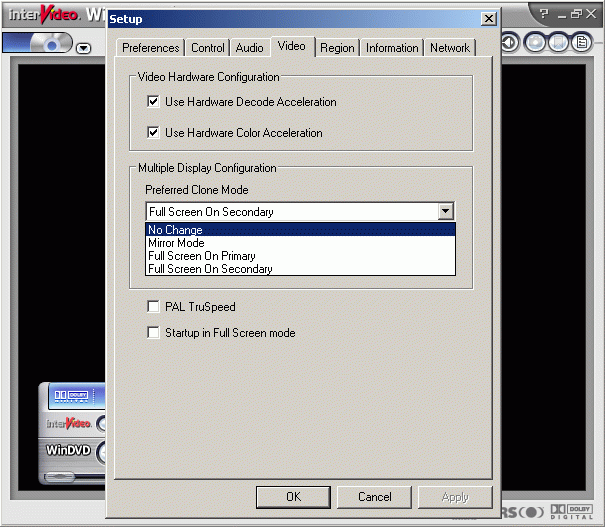 Приятно видеть, что тенденция к повышению удобства работы с ТВ-выходом и мультимониторными конфигурациями у разработчиков проигрывателей, о которой мы впервые заговорили в прошлом материале, за прошедшее время получила развитие. Так, InterVideo WinDVD5 получил более широкие настройки по сравнению с предыдущей версией