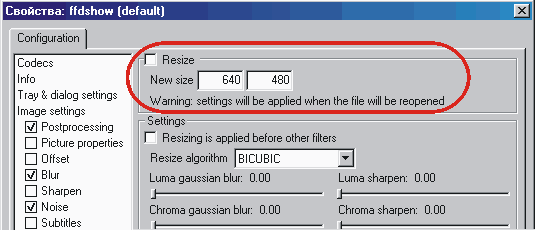 Во-первых, при использовании декодера FFDShow, о котором подробно было написано в предыдущей статье, можно задействовать его функцию Resize для увеличения горизонтального разрешения свыше 640.