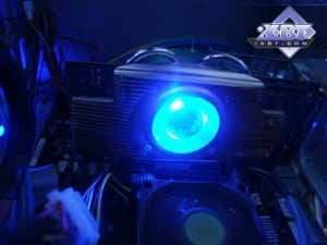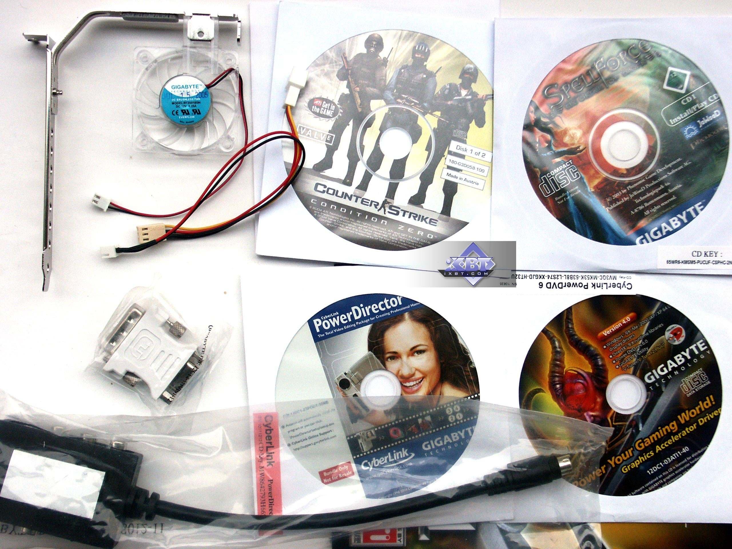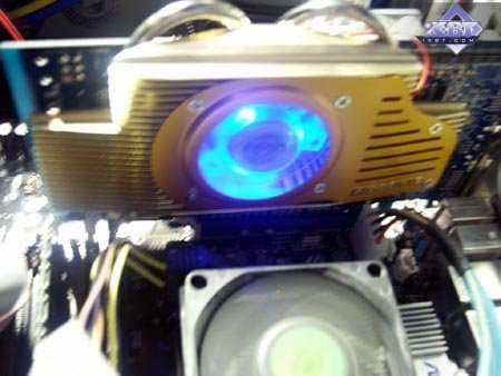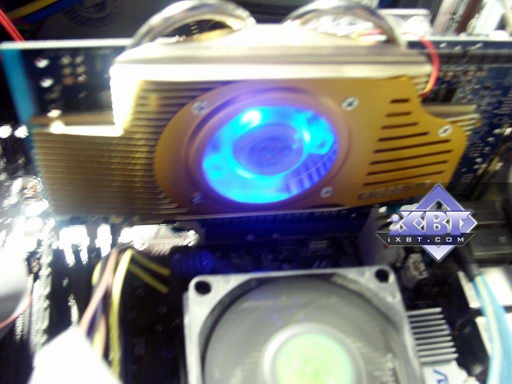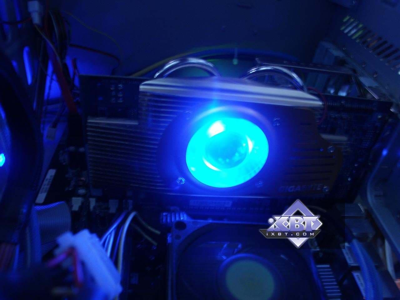 Еще по коллажу было видно, что вентилятор у Gigabyte RADEON X800 XL 512MB имеет красивую синюю подсветку. Вот так она смотрится в темноте. Также в нашем видеоролике можно все это увидеть, так сказать, в живом виде. Из-за такой системы охлаждения карта получилась довольно громоздкой, плюс на отдельном брекете поставляется небольшой вентилятор для обдува радиатора с передней стороны платы (это уже для оверклокеров, поскольку на штатных частотах плата не перегревается и без дополнительного охлаждения).