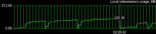 Три всплеска до максимального использования видеопамяти — это запуск в более низких разрешениях (1024 и 1280), логично смотрится то, что память там используется в меньшей степени. Итак, эта довольно тяжелая игра требует 225 мегабайт памяти для работы в 1600х1200 при АА+АФ. В принципе, все современные мощные ускорители обладают таким объемом памяти, поэтому никаких особо емких передач по шине не требуется.