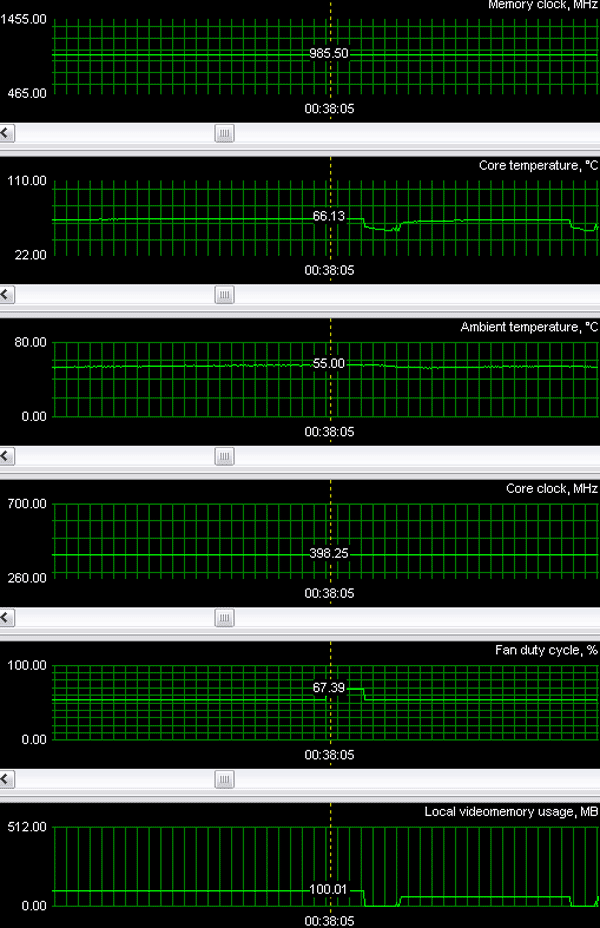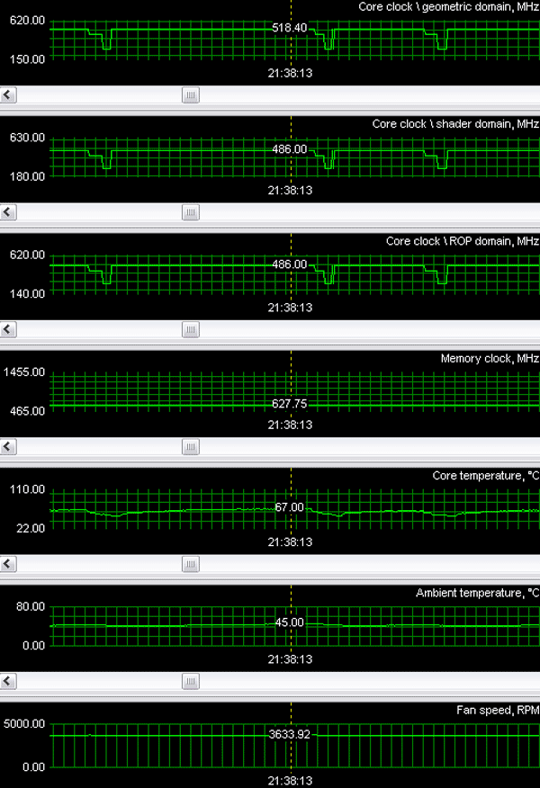 При тестировании карт в условиях закрытого корпуса и без наличия дополнительного охлаждения (температура в помещении была около +22 градусов), мониторинг температур нагрева ядер (с помощью утилиты RivaTuner, автор А.Николайчук AKA Unwinder) показал: