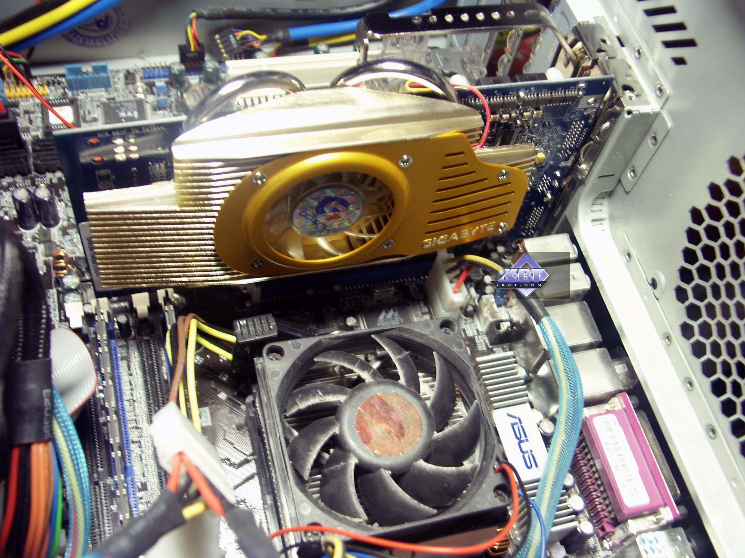 Это очевидно, да и по снимкам хорошо просматривается, что GeForce 7800GTX от Gigabyte — это все та же самая эталонная карта. Причем Gigabyte имеет отношение только к производству наклейки на кулер. И все. И, разумеется, его сотрудники задействованы в отборе карт, гарантированно работающих на повышенных частотах. Все же встречаются иногда GTX, которые не работают на частотах выше 460 МГц по ядру. Не могу сказать, где ведется отбор и на уровне чего: чипов или уже карт. Еще на стадии производства ГДЕ-ТО по заказу NVIDIA, или уже когда карты привезены на склад Gigabyte, и проводится тестирование готовых плат. Полагаю, что NVIDIA такими вопросами заниматься вряд ли будет, даже по просьбам партнеров, поэтому склоняюсь к мысли, что уже произведенные готовые платы поступают в тестлаб Gigabyte и там уже проводится их отбор.