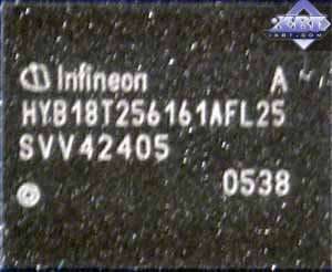 | Карта имеет 256 МБ памяти GDDR2 SDRAM, размещенной в 8-ми микросхемах на лицевой стороне PCB. Микросхемы памяти Infineon. Время выборки у микросхем памяти 2.5ns, что соответствует частоте работы 400 (800) МГц. | ![]() |