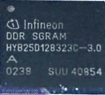 Микросхемы памяти производства Infineon. Время выборки у микросхем памяти 3ns, что соответствует частоте работы 333 (666) МГц, память же работает на частоте 300 (600) МГц. Частота работы GPU 335 MHz. Шина обмена с памятью 256 bit. | ![]() |