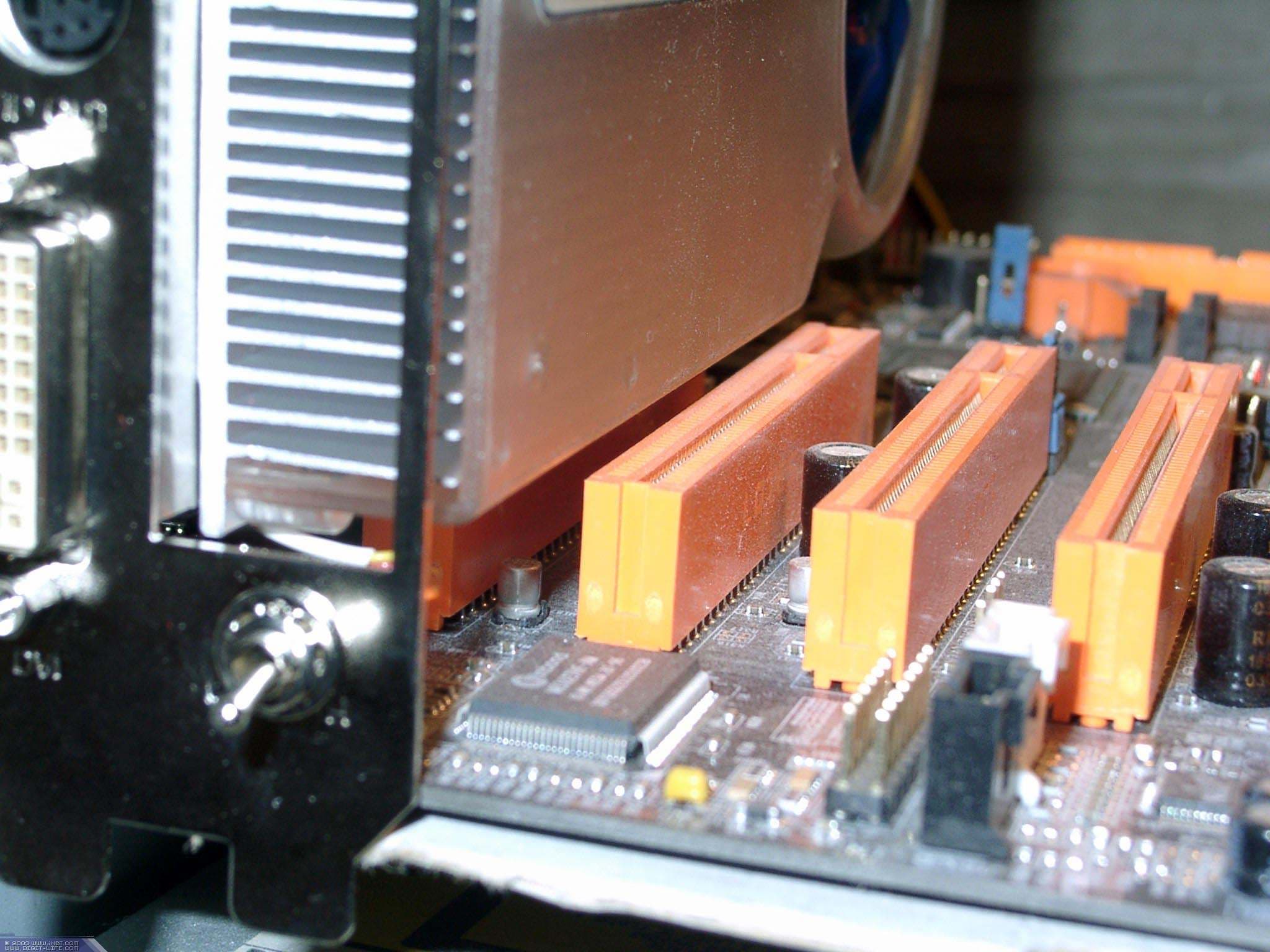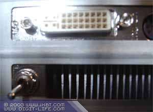 К большому сожалению, он установлен столь низко в брэкете, что в некоторые корпуса, где вырез под гнезда плат расширения начинается выше уровня системной платы, такая карта просто не установится, будет мешать тумблер: на снимке выше это показано: видно, что нижний винт DVI-гнезда так и не дошел до самого низа выреза не дает тумблер.